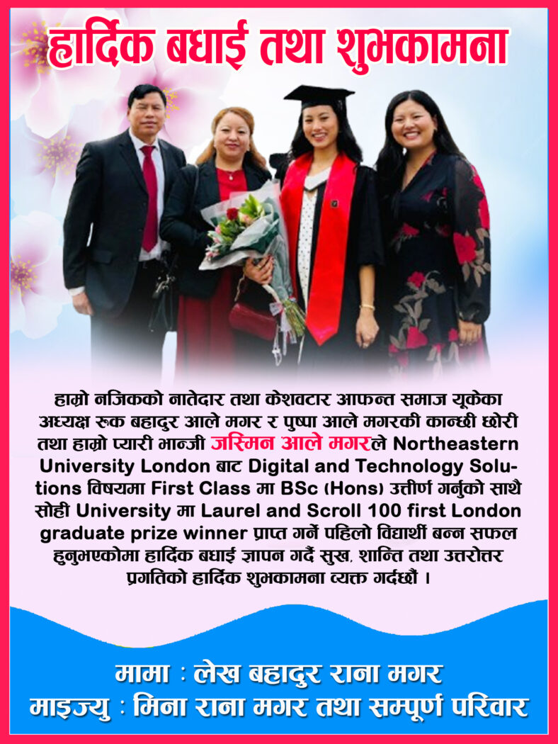 हार्दिक बधाई तथा शुभकामना : जस्मिन आले मगर
