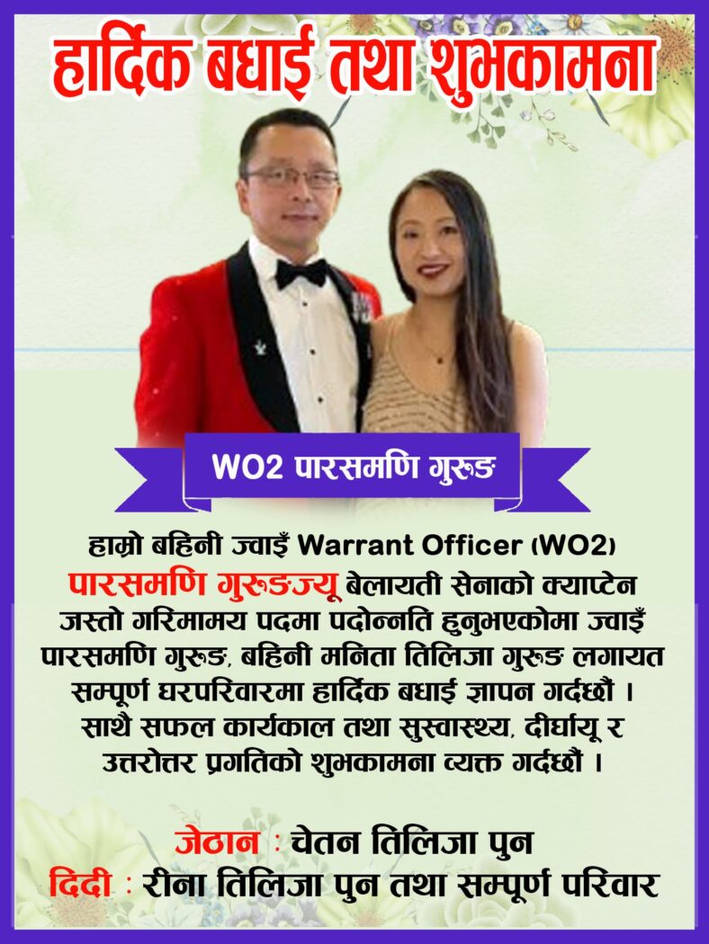 हार्दिक बधाई तथा शुभकामना : W02 पारसमणि गुरूङ