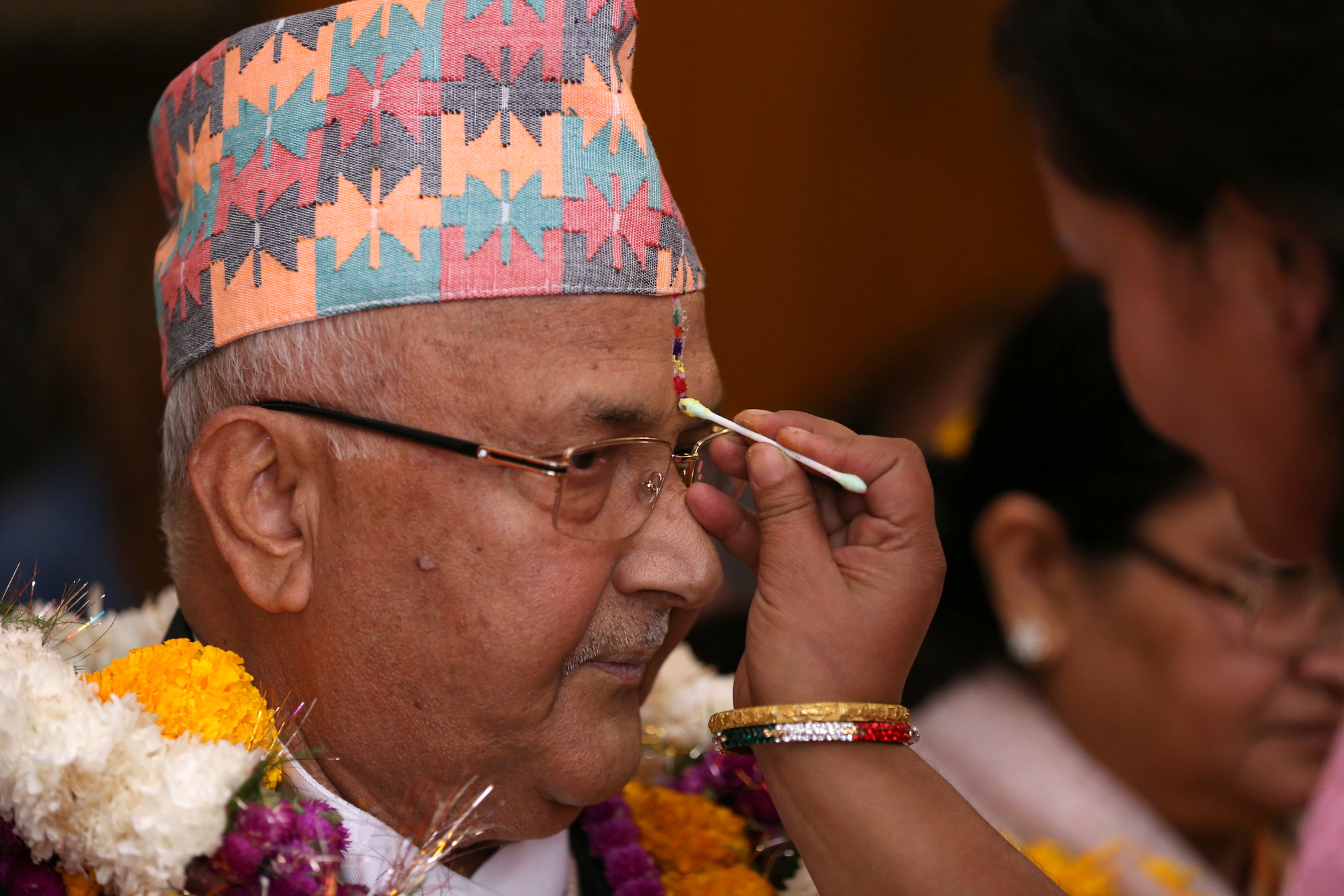 प्रधानमन्त्री केपी शर्मा ओलीले आफ्नी बहिनीद्वय विष्णुमाया ढकाल र कौशिलादेवी कोइरालाबाट बिहीबार बिहान ११ बजेर ५५ मिनेटको शुभसाइतमा टीका लगाएका थिए । टीका लगाइदिएपछि उनीहरूले प्रधानमन्त्री ओलीलाई मखमलीको माला लगाई कटुस, ओखर र मिठाई खुवाएर वात्सल्य प्रस्तुत गरे । साथै उनीहरूले प्रधानमन्त्री पत्नी राधिका शाक्यलाई पनि टीका लगाए ।