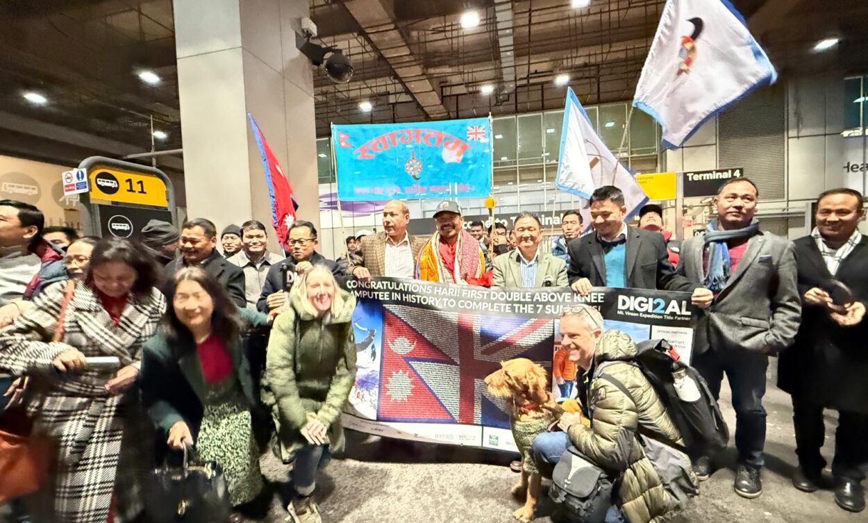 मंगलबार, २० जनवरी २०२६ । संसारका सातवटै महादेशका अग्ला शिखरहरू (Seven Summits) सफलतापूर्वक आरोहण गरी विश्व कीर्तिमान कायम गरेका डा. हरि बुढा मगर, MBE, बेलायत फर्किएका छन्। मंगलबार लन्डनस्थित हिथ्रो विमानस्थलको टर्मिनल ४ मा ओर्लँदा उनलाई भव्य स्वागत तथा बधाई ज्ञापन गरियो।