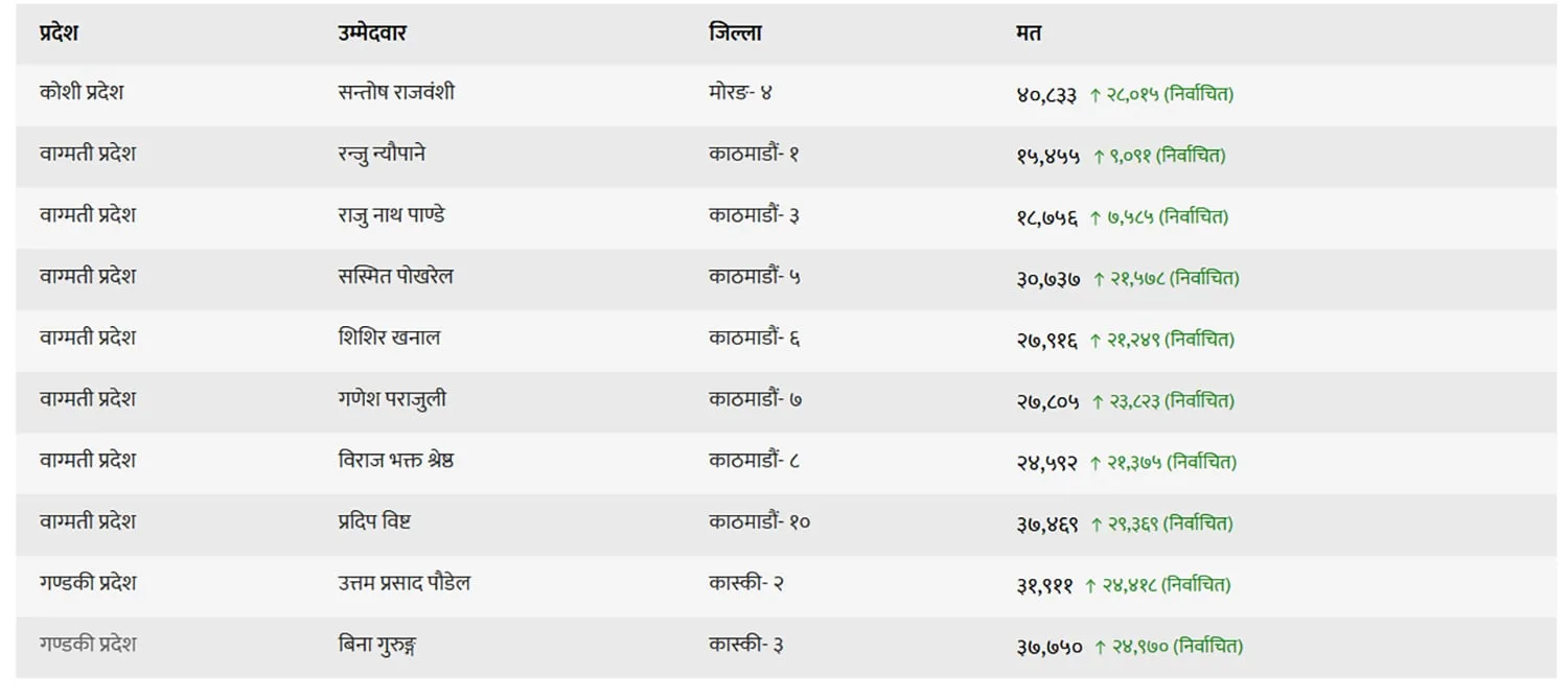 नेपाल कम्युनिस्ट पार्टी (एमाले)का १४ उम्मेदवारले अग्रता कायम गरेका छन् भने नेपाली कम्युनिष्ट पार्टी (नेकपा)का १० उम्मेदवारले अग्रता कायम गर्दा दुई उम्मेदवार विजयी भएका छन् ।