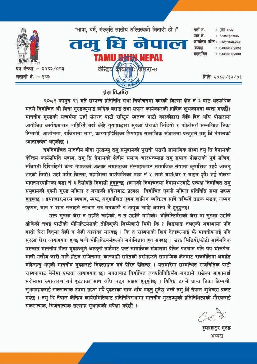 पोखरा । तमु धिं नेपालले कास्की–३ बाट प्रतिनिधिसभा सदस्यमा निर्वाचित बिना गुरुङसम्बन्धी सामाजिक सञ्जालमा भइरहेको आलोचना र टिप्पणीप्रति ध्यानाकर्षण भएको जनाएको छ ।