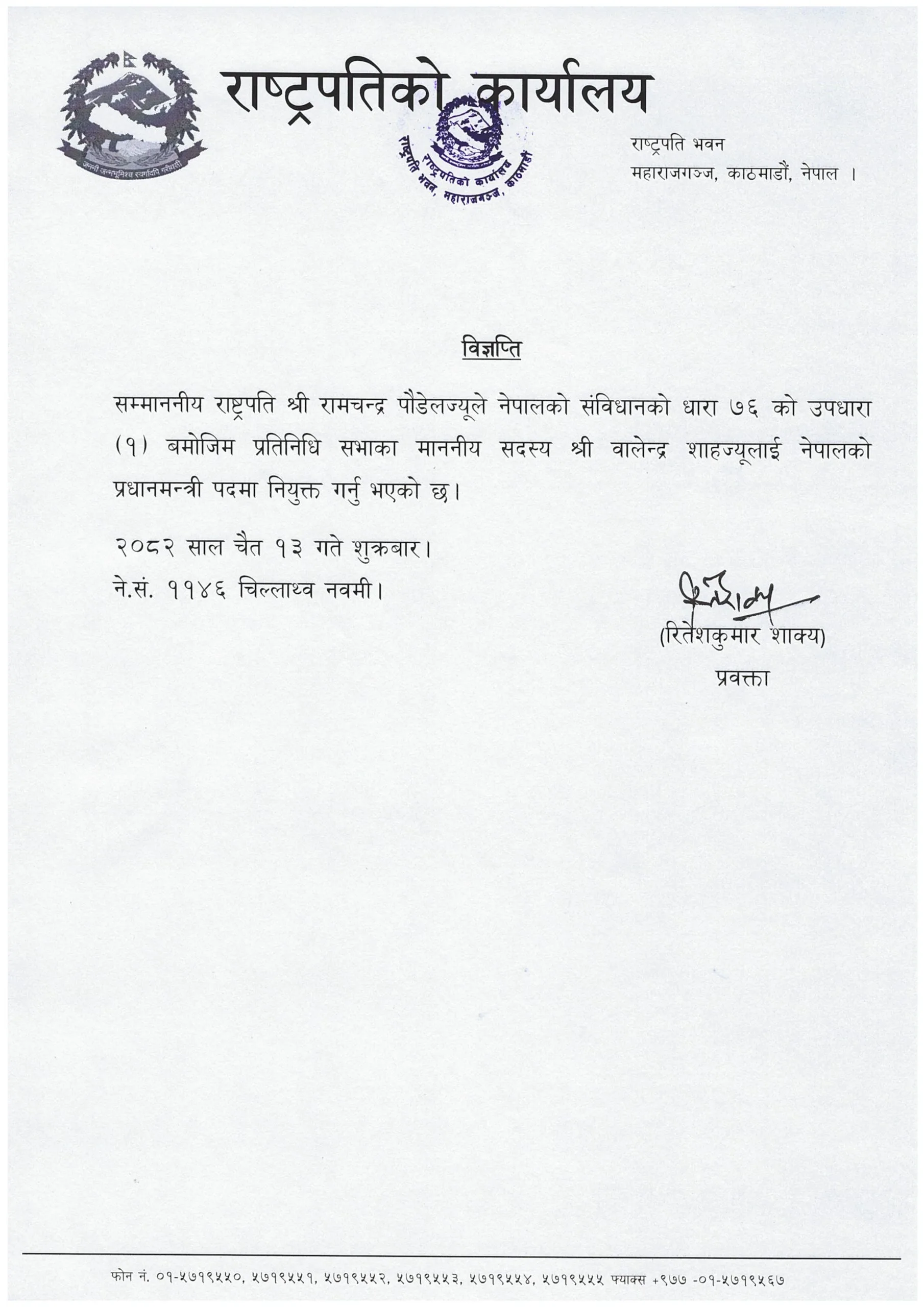 काठमाडौँ । नेपालका राष्ट्रपति रामचन्द्र पौडेलले नेपालको संविधानको धारा ७६ को उपधारा (१) बमोजिम प्रतिनिधिसभा सदस्य बालेन्द्र शाहलाई प्रधानमन्त्री नियुक्त गरेका छन् । उक्त कुरा राष्ट्रपतिको कार्यालयले जारी गरेको विज्ञप्तिमा जनाइएको छ ।