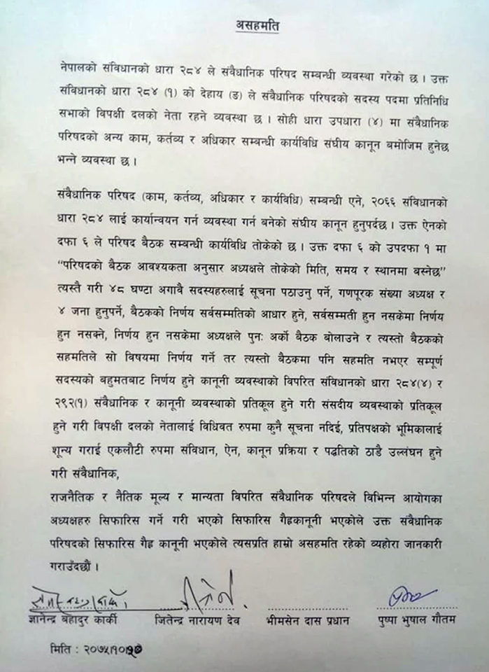 त्यसपछि सुनुवाइ समितिमा रहेका कांग्रेस सांसदहरु कार्की, जीतेन्द्र देव, पुष्पा भुसाल लिखित असहमति बुझाएर बैठकबाट बाहिरिएका हुन् । गत माघ ६ गते बसेको संवैधानिक परिषदको बैठकले प्राकृतिक स्रोत तथा वित्त आयोग, राष्ट्रिय समावेशी आयोग, थारु आयोग, मुस्लिम आयोग र मधेसी आयोगको अध्यक्ष नियुक्ति गरेको थियो । तर उक्त निर्णय गर्दा परिषदको सदस्य तथा विपक्षी दलका नेता शेरबहादुर देउवा सहभागी थिएनन् ।