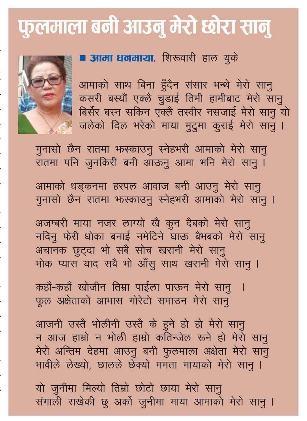 रातमा पनि जुनकेरी बनी आऊनु आमा भनि मेरो सानु ।