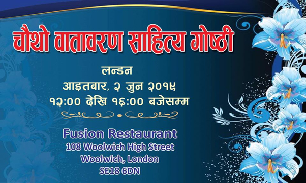 बिजय हितान लन्डन । आउँदो २ जुन आइतबारका दिन चौथो वातावरण साहित्य गोष्ठी हुने भएको छ । बेल्पाली साहित्यिक संस्थाहरुको संयुक्त आयोजनामा लन्डनको उलवीचमा गोष्ठी हुन लागेको हो । गोष्ठीमा बेलायतका लागि नेपाली राजदूत तथा