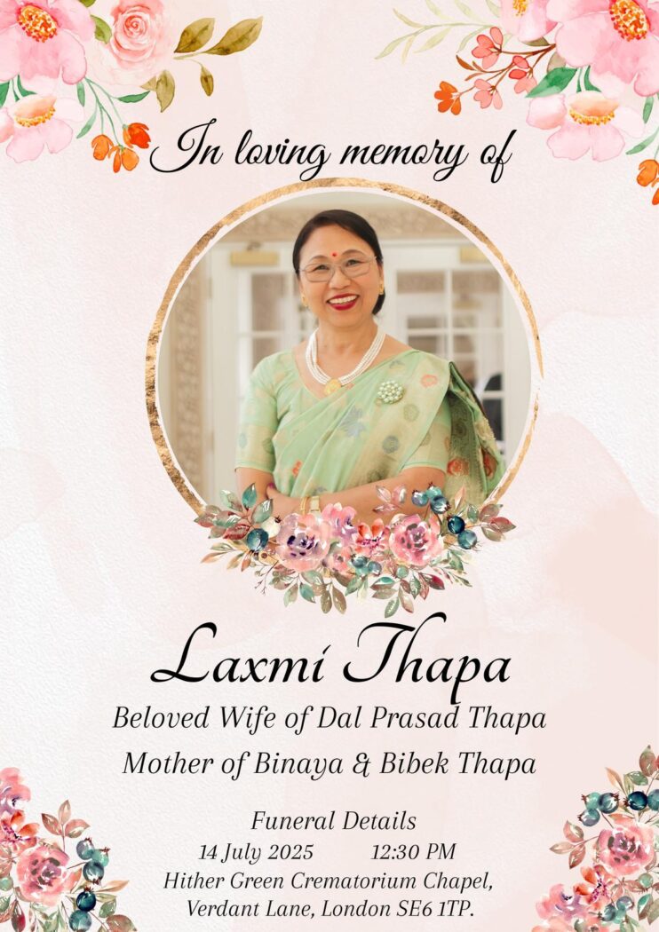 स्वर्गीय लक्ष्मी थापा मगरको अन्त्येष्टि सेवा सोमवार १४ जुलाई २०२५ का दिन हुने बिहिवार १० जुलाई २०२२५ – बेलायत। साउथ इष्ट लन्डन मगर महिला संघका अध्यक्ष स्वर्गीय लक्ष्मी थापा मगरको अन्त्येष्टि सेवा सोमवार १४ जुलाई २०२५ का दिन हुने भएको छ। स्वर्गीय लक्ष्मी थापा मगरका श्रीमान दल प्रसाद २०८२ असार २६, बिहीबार ११:२४ No Comments