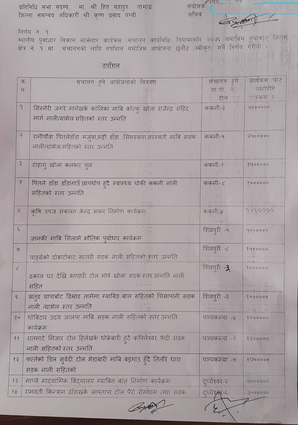 सत्तारुढ नेकपाका प्रदेश नम्बर ३ का सहइञ्चार्जसमेत रहेका पूर्वमन्त्री तामाङका अनुसार ककनी गाउँपालिकामा ५ योजना, शिवपुरी गाउँपालिकामा ४, पञ्चकन्या गाउँपालिकामा ३, दुप्चेश्वर गाउँपालिका ४, तादी गाउँपालिका ४, लिखु गाउँपालिका ४ र सूर्यगढी गाउँपालिकामा पनि ४ योजनामा बजेट बाँडिएको छ । उनले प्रशासनिक खर्चबापत ५ लाख ४० हजार रुपैयाँ छुट्याएका छन् ।