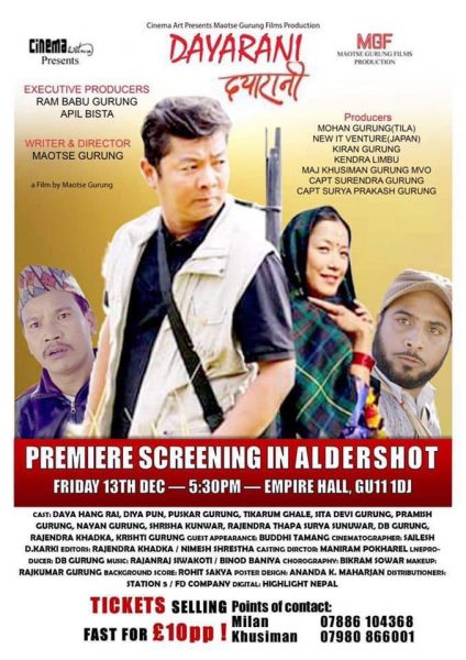 त्यस्तै, पछिल्लो समय थुप्रै सफल नेपाली चलचित्रको अभिनय तथा निर्देशन गरिसकेका माओत्से गुरुङको लेखन तथा निर्देशन रहेको सो चलचित्रको टिकट १० पाउन्ड तोकिएको र टिकटका लागि मेजर खुशीमान गुरुङ एमभिओ र फोटो पत्रकार मिलन तमुलाई सम्पर्क गर्न प्रदर्शन समूहले अनुरोध