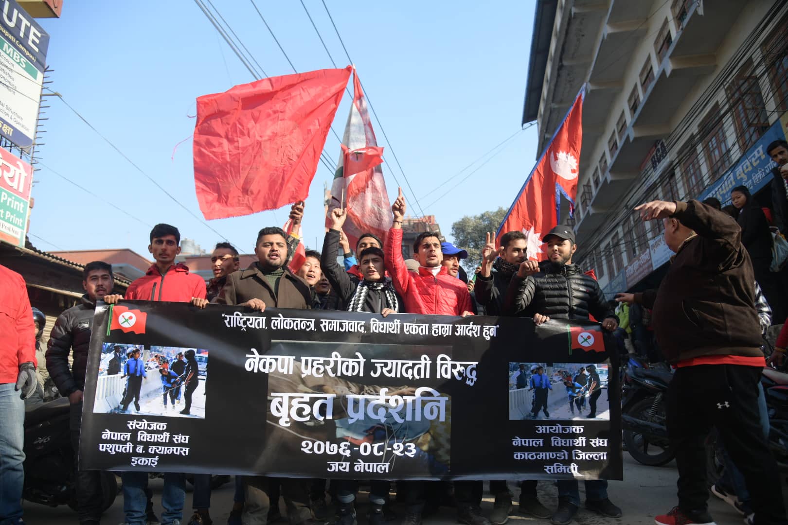 नेविसंघ काठमाडौं जिल्ला समितिको आयोजना र पशुपति क्याम्पस इकाइ समितिको संयोजनमा गरिएको प्रदर्शनमा सहभागीहरुले प्रहरी दमनको विरोध गर्दै नाराबाजी गरे । उनीहरुले गृहमन्त्रीको समेत राजीनामा मागेका छन् । पशुपति क्याम्पसबाट सुरु भएको विरोध र्याली चाबहिल चोक परिक्रमा गरी पुनः पशुपति क्याम्पसमा आएर समापन भएको थियो ।