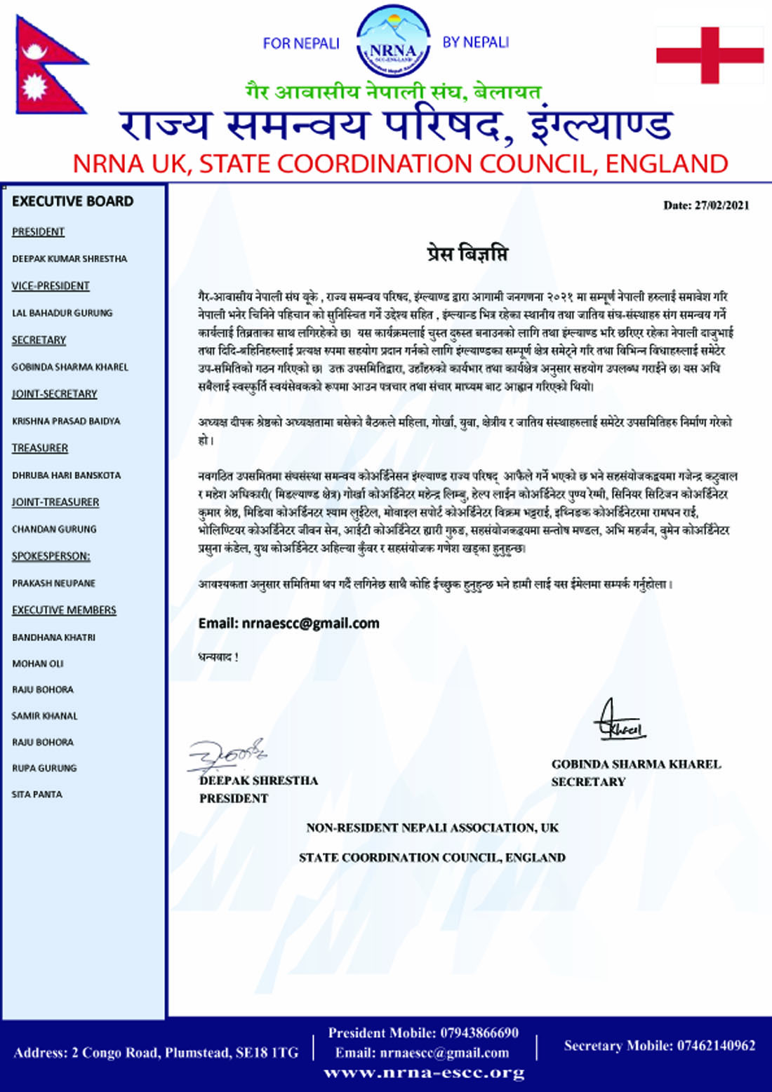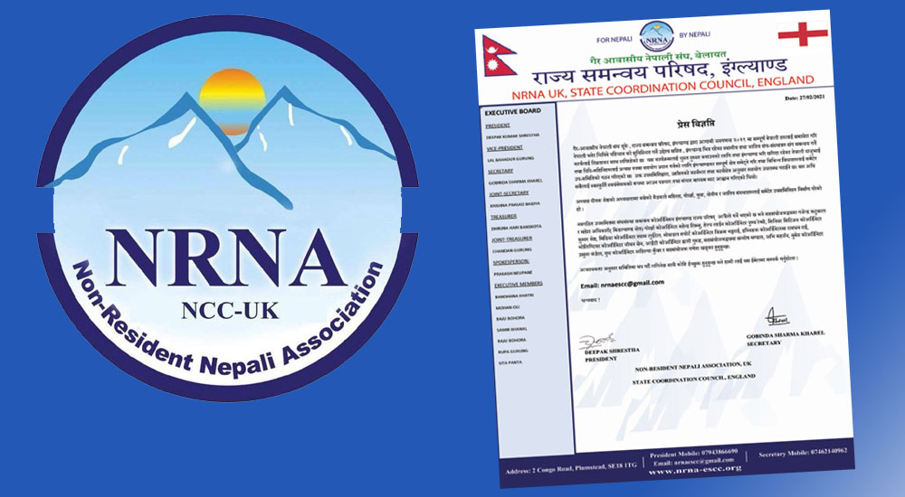 नवगठित उपसमितमा संघसंस्था समन्वय कोअर्डिनेसनमा इंग्ल्याण्ड राज्य परिषद् अध्यक्ष दीपक श्रेष्ठ, सहसंयोजकद्वयमा गजेन्द्र कटुवाल र महेश अधिकारी, गोर्खा कोअर्डिनेटर महेन्द्र लिम्बु, हेल्प कोअर्डिनेटर पुण्य रेग्मी, सिनियर सिटिजन कोअर्डिनेटर कुमार श्रेष्ठ, मिडिया कोअर्डिनटर श्याम लुइँटेल, मोबाइल सपोर्ट कोअर्डिनेटर विक्रम भट्टराई, इथ्निङक कोअर्डिनेटरमा रामधन राई, भोलिण्टियर कोअर्डिनेटर जीवन सेन, आईटी कोअर्डिनेटर ह्यारी गुरुङ, सहसंयोजकद्वयमा सन्तोष मण्डल, अभि महर्जन, वुमेन कोअर्डिनेटर प्रसुना कंडेल, युथ कोअर्डिनेटर अहिल्या कुँवर र सहसंयोजक गणेश खड्का रहेका अध्यक्ष दीपक श्रेष्ठ र सचिव गोविन्द खरेलद्वारा हस्ताक्षरित विज्ञप्तिमा जनाइएको छ ।
