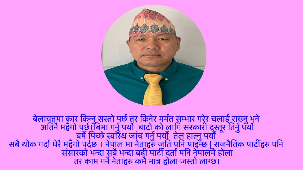 जव सम्म घुम्ती बाटोमा नया नया सवारी साधानको साथमा नया नियम जानेको कुशल ड्राइबरहरु आउदैन तब सम्म त्यो पुरानो कार ले इन्जिन हरु खराब हुदै गए पछि बातावरण लाइ प्रदुषण बनाउदै गएको हुन्छ अनि ड्राइबरको आँखाहरु पनि धमिलो हुदै गए पछि दुर्घटना हरु निम्त्याउने गर्दछ। सबैले नया कार अनि नया बाटो को नै इच्छा गरेको हुन्छ। बेलायतमा कार किन्नु सस्तो पर्छ तर किनेर मर्मत सम्भार गरेर चलाई राख्नु भने अतिनै महँगो पर्छ। बिमा गर्नु पर्यो , बाटो को लागि सरकारी दस्तूर तिर्नु पर्यो , बर्षे पिच्छे स्वास्थ जांच गर्नु पर्यो तेल हाल्नु पर्यो , सबै थोक गर्दा धेरै महँगो पर्दछ । नेपाल मा नेताहरु जति पनि पाइन्छ , राजनैतिक पार्टीहरु पनि संसारको भन्दा सबै भन्दा बढी पार्टी दर्ता पनि नेपालमै होला तर काम गर्ने नेताहरु कमै मात्र होला जस्तो लाग्छ।
