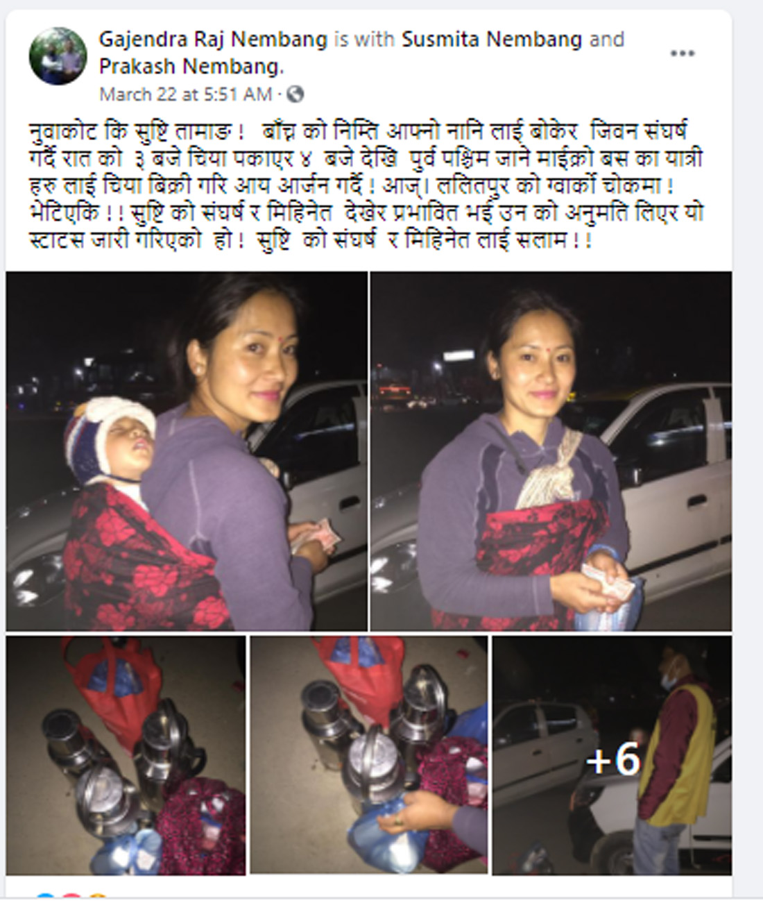मनोक्रान्ति अभियानका विदेश विभाग प्रमुख योगी गजेन्द्रराज नेम्वाङले चैत ९ गते (२२ तारिख) का दिन ग्वार्को चोकमा ढाडमा छोरी बोकेर झिसमिसेमै चिया बेच्दै गरेकी सृष्टिको तामाङ तस्बिर फेसबुकमा पोस्ट भएपछि एक्कासी भाइरल बनेकी उनलाई बेलायत हन्स्लो निवासी समाजसेवी कृष्ण पुन मगर, रेडिङ निवासी कमल गुरुङ लगायतले सहयोग गरेका हुन् । सेवानिवृत्त पुन मगरले आइतबार सृष्टिको हातमा हालिदिनु भन्दै २५ हजार बैंकमा ट्रान्सफर गरेको योगी नेम्वाङले जनाए । त्यस्तै रेडिङका गुरुङले ८ हजार रुपैयाँ सहयोग पठाएका छन् ।