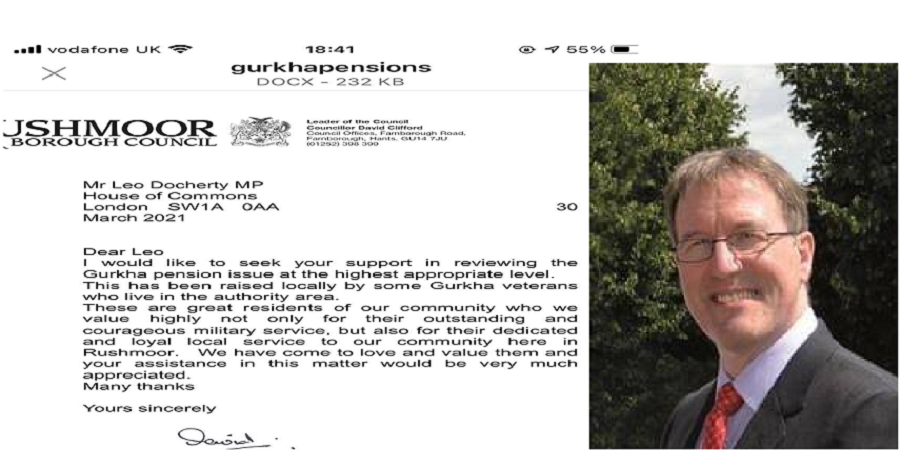 उनले स्थानीय सांसद लियो डोकर्टीलाई ३० मार्च मंगलबार एक पत्र लेख्दै गोर्खा पेन्सन पुनरावलोकनका लागि उच्च तहमा पहलको साथ खोजेका हुन् । ब्रिटिश सेनामा गोर्खाहरुले गरेका योगदानमात्र होइन्, रसमोर क्षेत्रमा स्थानीय समुदायप्रति उनीहरुको लगाव र सेवाको पनि उचित मुल्यांकन गरेको बताउंदै नेता डेभिडले समान पेन्सन मुद्दामा सांसदको साथ प्रशंसनीय हुने पनि उल्लेख गरेका छन् ।