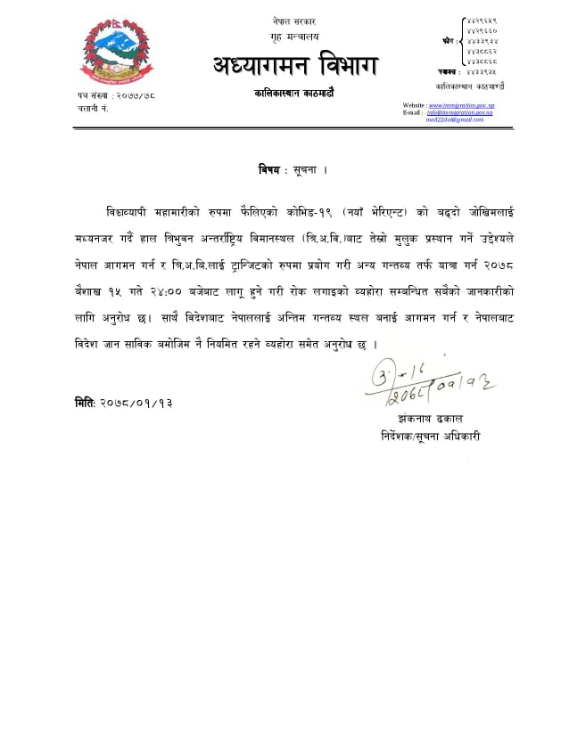 त्रिभुवन विमानस्थललाई अन्तिम गन्तव्य बनाएर विदेशबाट आउन तथा उक्त विमानस्थलबाट विदेश जान पाउने व्यवस्थामा भने कुनै फेरबदल नगरिएको पनि उक्त विभागले जनाएको छ ।