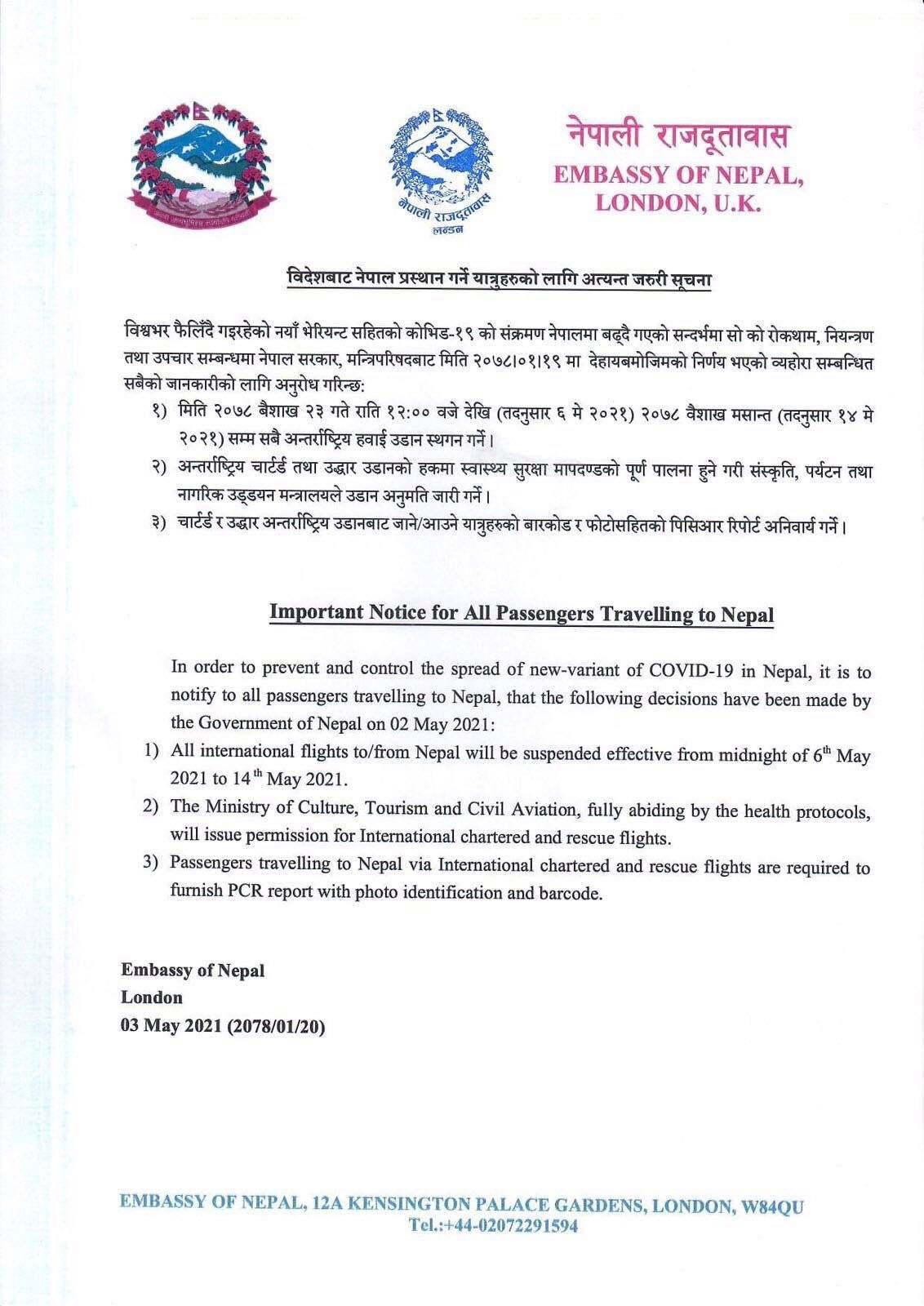 दूतावासले सोमबार साँझ नेपालमा कोरोना भाइरस बढ्दै गएको सन्दर्भमा मन्त्रिपरिषद्को आइतबारको बैठकले २३ गते राति १२ बजेदेखि (तदनुसार ६ मे २०२१) वैशाख मसान्तसम्म सबै हवाई अन्तर्राष्ट्रिय उडान स्थगन गर्ने, अन्तर्राष्ट्रि य चार्टर्ड तथा उद्धार उडानको हकमा स्वास्थ्य सुरक्षा मापदण्डको पूर्ण पालना हुने गरी संस्कृति, पर्यटन तथा नागरिक उड्डयन मन्त्रालयले उडान अनुमति जारी गर्ने, चार्टर्ड र उद्धार अन्तर्राष्ट्रिय उडानबाट जाने/आउने यात्रुहरुको बारकोड र फोटोसहितको पीसीआर रिपोर्ट अनिवार्य गर्ने निर्णयबारे सूचनामार्फत जानकारी गराएको हो ।