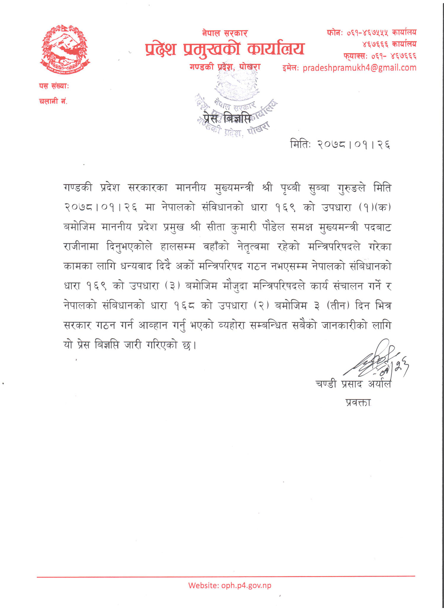 पोखरा वैशाख २६ । गण्डकी प्रदेशका मुख्यमन्त्री पृथ्वीसुब्बा गुरुङले राजीनामा दिएका छन् ।