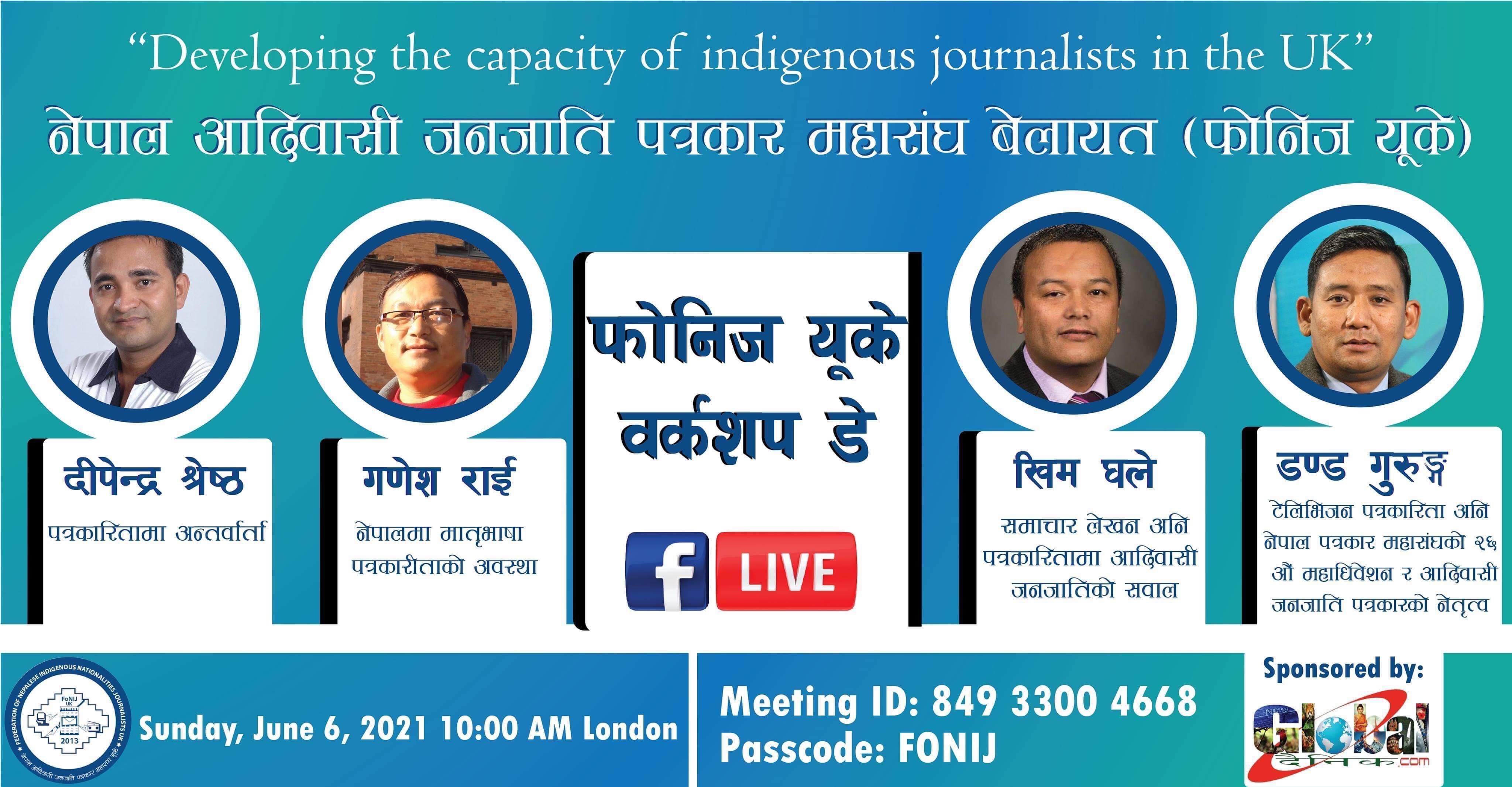 लन्डन – यहि आउँदो जुन महिनाको ६ तारिख नेपाल आदिबासी जनजाति पत्रकार महासंघ युके ( फोनिज युके ) द्दारा जुम भर्चुअलको माध्यमबाट पत्रकारिता तालिम ( workshop ) कार्यक्रम आयोजना गर्ने भएको छ ।