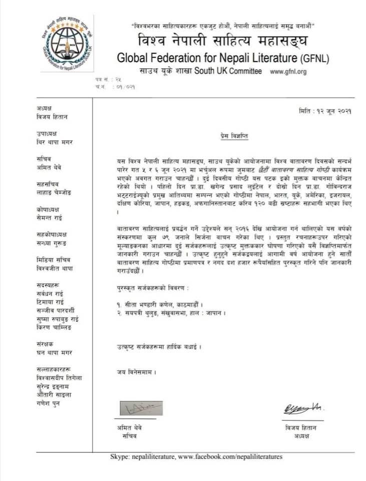 विश्व वातावरण दिवसको सन्दर्भमा गत जुन ५ र ६ तारिखमा जुमबाट आयोजित गोष्ठीमा वाचन गरिएका रचनाहरुमाथि मूल्यांकन गरी काठमाडौंकी सीता भण्डारी कँडेल र संखुवासभाकी सयपत्री थुलुङ (हाल जापान) लाई उत्कृष्ट ठहर्याइएको हो ।