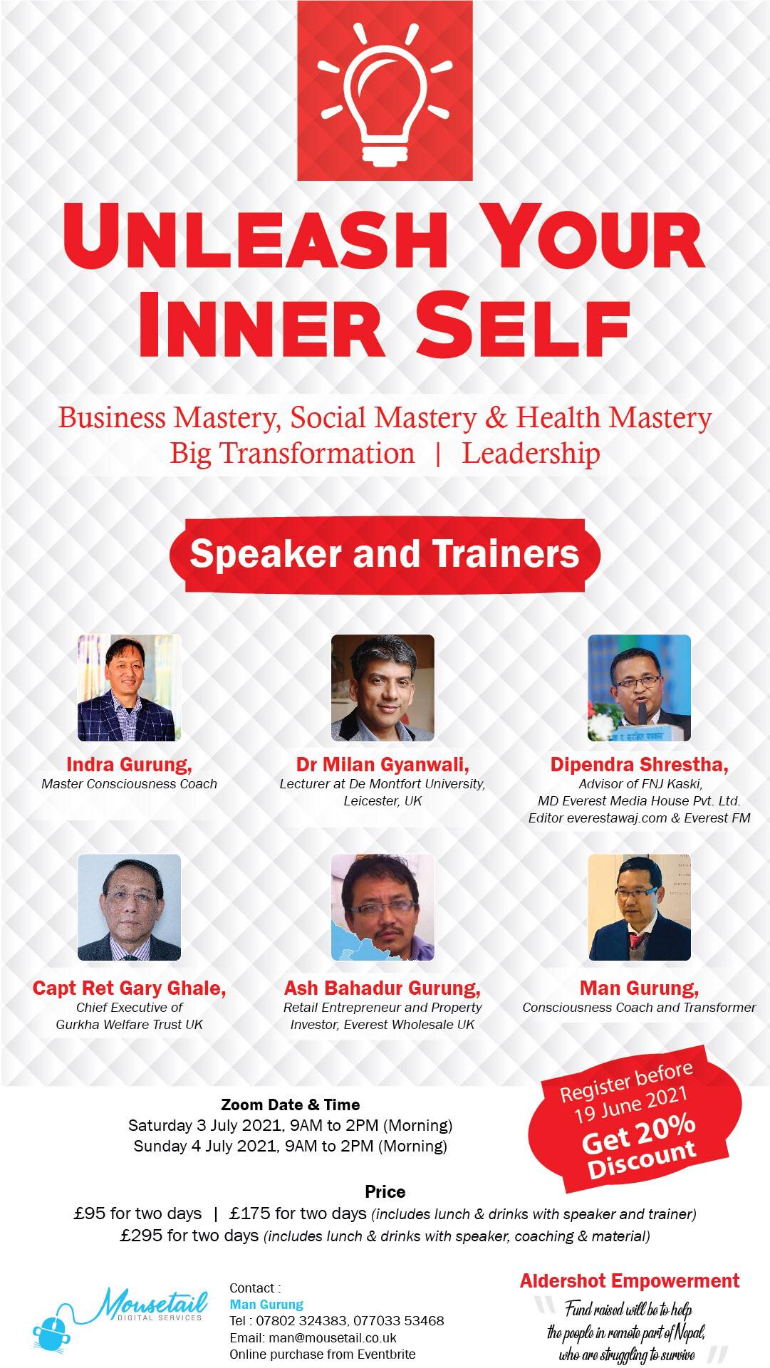 ‘अनलिस योर इनरसेल्फ’ शीर्षकमा हुने सो कार्यक्रममा सम्बन्धित क्षेत्रका विज्ञहरुको उपस्थिति रहने आयोजक माउसटेल वेब सर्भिसेस् अल्डरसटका निर्देशक मान गुरुङले जानकारी दिए । बेलायतको स्थानीय समयअनुसार बिहान ९ देखि दिउँसो २ बजेसम्म हुने कार्यक्रममा नेपाल, बेलायत लगायत संसारभरबाट सहभागी हुन पाइने निर्देशक गुरुङले बताए । उनका अनुसार सशुल्क हुन लागेको कार्यक्रमबाट वचत रकमको निश्चित प्रतिशत कोभिड महामारी पीडित नेपालका दुर्गम क्षेत्रमा सहयोग गर्ने पनि घोषणा गरिएको छ ।