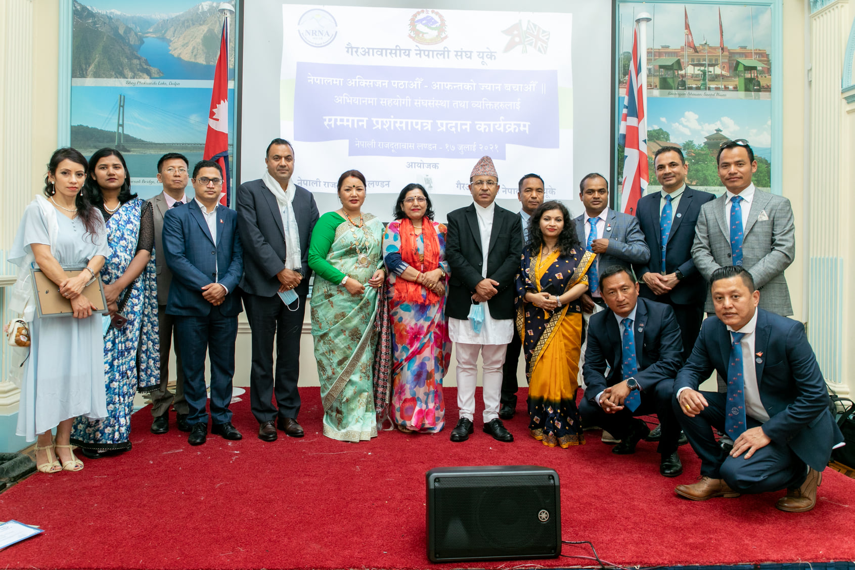 नेपाली दूतावास र एनआरएनए यूकले शनिबार लन्डनस्थित नेपाली दूतावास भवनमा आयोजित कार्यक्रममा आर्थिक सहयोग गर्ने संघसंस्थाका प्रमुख एवं व्यक्ति गरी करिब ६० जनालाई राजदूत लोकदर्शन रेग्मी र एनआरएनए यूके अध्यक्ष पुनम गुरुङले खादा र प्रमाणपत्रले सम्मान गरेका हुन् । ।