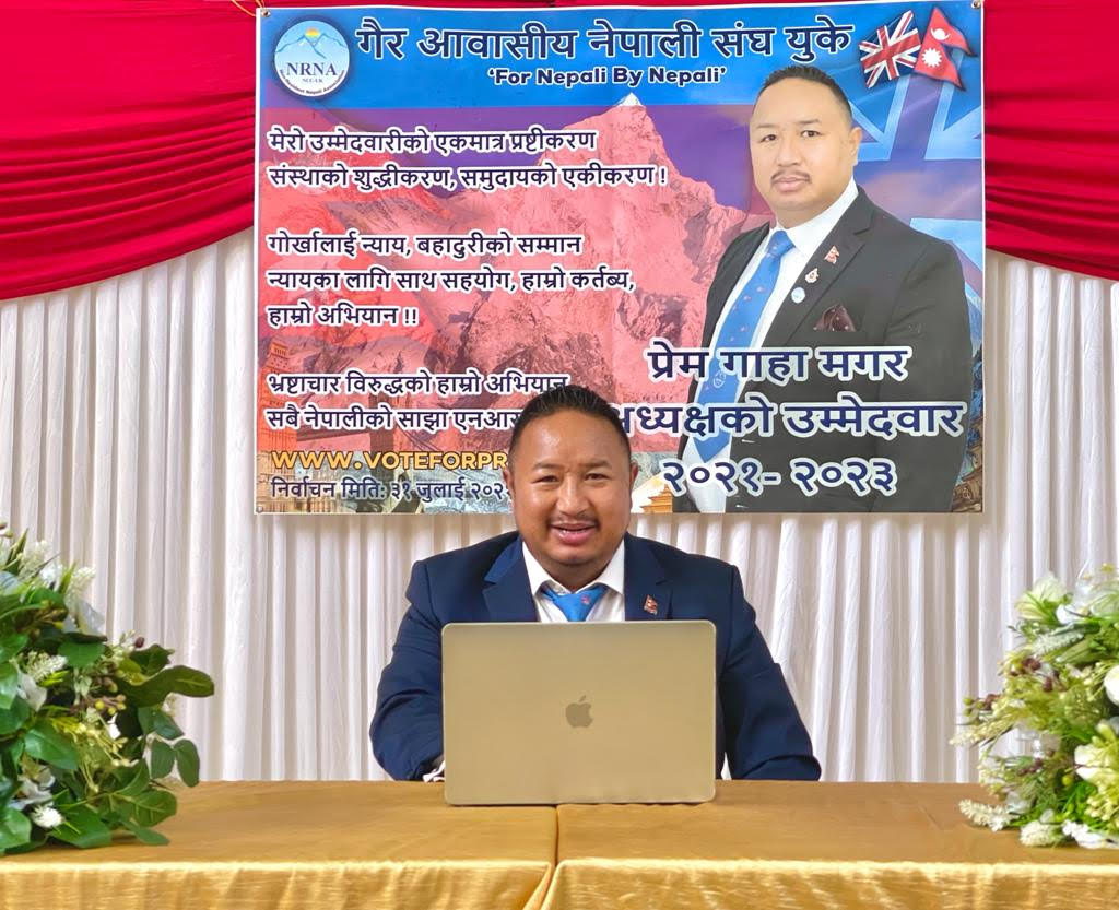 लण्डन – गैरआवासीय नेपाली संघ, यूकेको अध्यक्ष पदमा प्रेम गाहा मगरले उम्मेदवारी दर्ता गराएका छन् ।एनसीसी यूकेका उपाध्यक्ष रहेका गाहा मगरले २०२१–२०२३ कार्यकालका लागि अध्यक्ष पदमा उम्मेदवारी दर्ता गराएका हुन् । उनले गत साता आयोजित एक कार्यक्रममा अध्यक्ष पदका लागि आफ्नो उम्मेदवारी घोषणा गरेका थिए ।निर्वाचन समितिले जारी गरेको कार्यतालिका अनुसार गाहा मगरले आवश्यक सबै प्रक्रिया पूरा गरी अनलाइनमार्फत उम्मेदवारी दर्ता गराएका हुन् । लण्डनको अल्डरसटमा केही समर्थकहरुसँगै रहेका गाहा मगरले त्यहीँबाट उम्मेदवारी दर्ता गराएका हुन् ।यही ३१ जुलाईमा हुने निर्वाचनका लागि निर्वाचन समितिले सोमबार (१९ जुलाई) बिहान एक बजेदेखि साँझ ८ बजेसम्मका लागि उम्मेदवारी दर्ता गर्ने समय तोकेको थियो । निर्वाचन समितिले मतदान पनि अनलाइन प्रविधिबाट नै हुने स्पष्ट पारिसकेको छ ।
