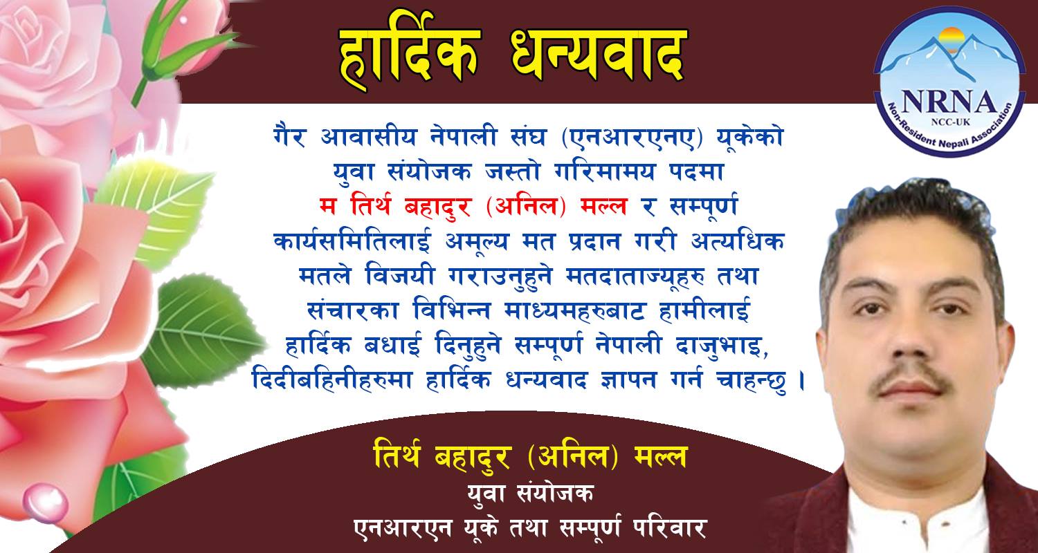 गैर आबशीय नेपाली संघ (एनआरएन) युकेको युवा संयोजक जस्तो गरिमामय पदमा म तिर्थ बहादुर (अनिल) मल्ल र सम्पूर्ण कार्यसमतिलाई अमुल्य मत प्रदान गरि अत्यधिक मतले बिजयी गराउनुहुने मतदाताज्युहरु तथा संचारका बिभिन्न माध्यामहरुबाट हामीलाई हार्दिक बधाई दिनुहुने सम्पूर्ण नेपाली दाज्युभाइ, दिदीबहिनिहरुमा हार्दिक धन्यवाद ज्ञापन गर्न चाहन्छु।