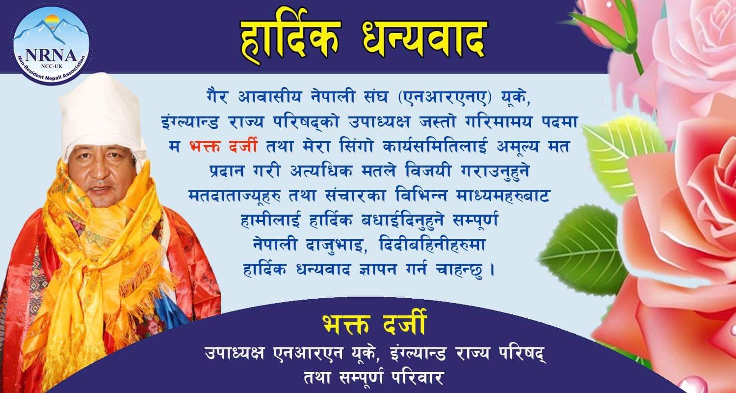 गैर आबशीय नेपाली संघ (एनआरएन) युके, इग्ल्याण्ड राज्य परिषद बेलायतको उपाध्यक्ष जस्तो गरिमामय पदमा म भक्त बहादुर दर्जी तथा मेरा सिंगो कार्यसमतिलाई अमुल्य मत प्रदान गरि अत्यधिक मतले बिजयी गराउनुहुने मतदाताहरु तथा संचारका बिभिन्न माध्यामहरुबाट हामीलाई हार्दिक बधाई दिनुहुने सम्पूर्ण नेपाली दाज्युभाइ, दिदीबहिनिहरुमा हार्दिक धन्यवाद ज्ञापन गर्न चाहन्छु।