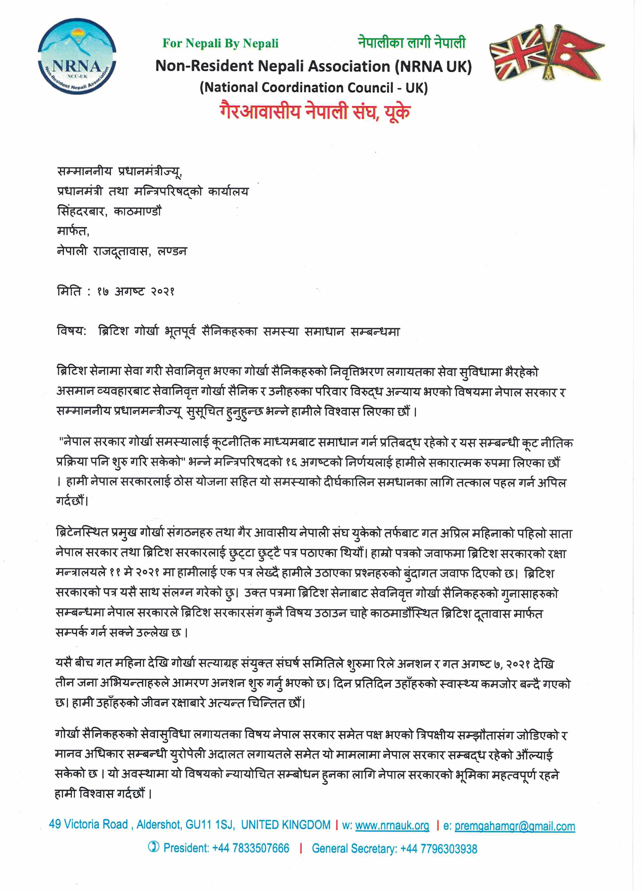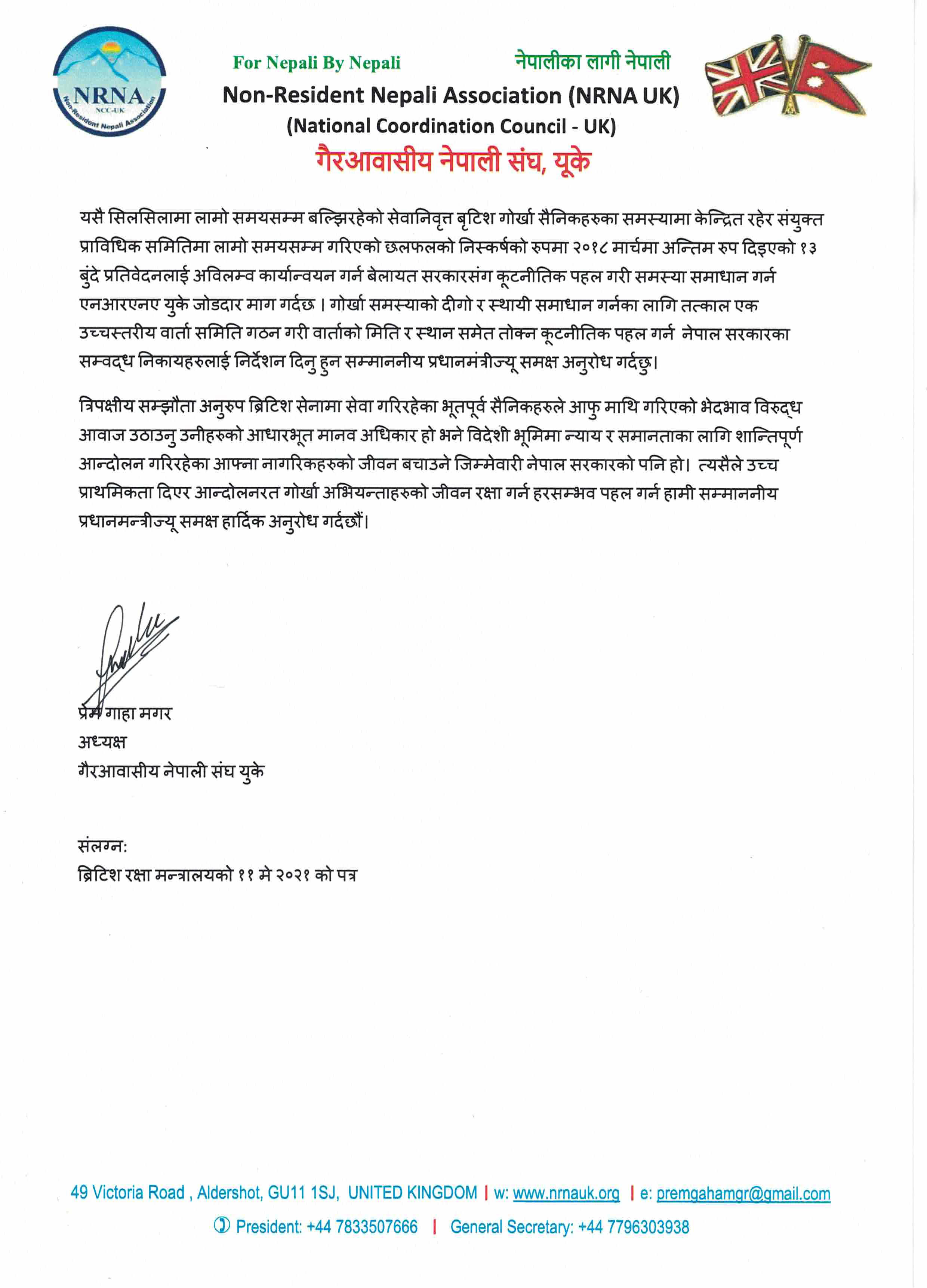 ‘लामो समयसम्म बल्झिरहेको सेवानिवृत्त बृटिश गोर्खा सैनिकहरुका समस्यामा केन्द्रित रहेर संयुक्त प्राविधिक समितिमा लामो समयसम्म गरिएको छलफलको निस्कर्षको रुपमा २०१८ मार्चमा अन्तिम रुप दिइएको १३ बुंदे प्रतिवेदनलाई अविलम्व कार्यान्वयन गर्न बेलायत सरकारसंग कूटनीतिक पहल गरी समस्या समाधान गर्न एनआरएनए युके जोडदार माग गर्दछ,’ अध्यक्ष गाहा मगरद्वारा हस्ताक्षरित ज्ञापनपत्रमा भनिएको छ ।