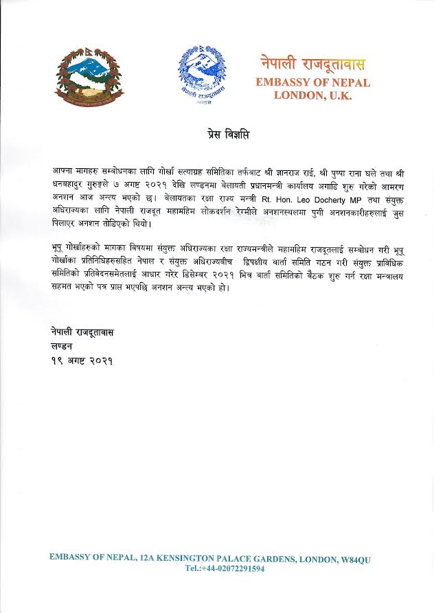 आफ्ना मागहरु सम्बोधनका लागि गोर्खा सत्याग्रह समितिका तर्फबाट श्री ज्ञानराज राई, श्री पुष्पा राना घले तथा श्री धनबहादुर गुरुङ्गले 7 अगष्ट २०२१ देखि लण्डनमा बेलायती प्रधानमन्त्री कार्यालय अगाडि शुरु गरेको आमरण अनशन आज अन्त्य भएको छ। बेलायतका रक्षा राज्य मन्त्री Rt. Hon. Leo Docherty MP तथा संयुक्त अधिराज्यका लागि नेपाली राजदूत महामहिम लोकदर्शन रेग्मीले अनशनस्थलमा पुगी अनशनकारीहरुलाई जुस पिलाएर अनशन तोडिएको थियो।
