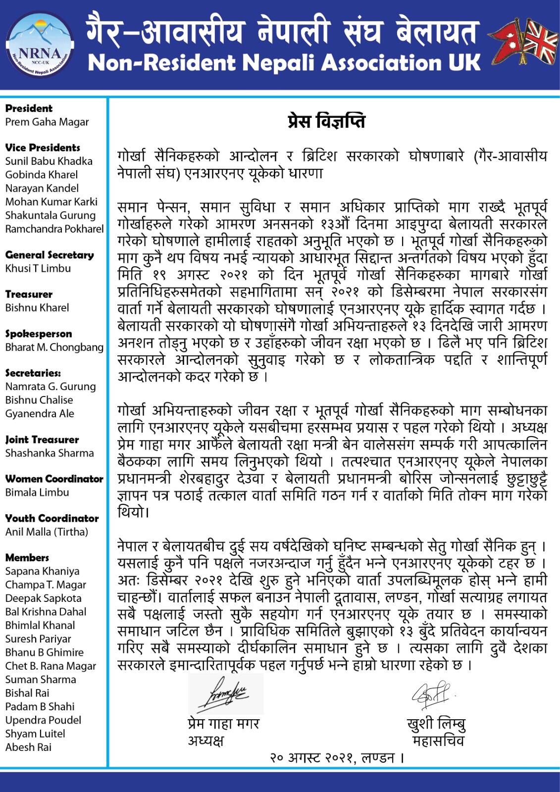 प्रेस विज्ञप्ति:गैर आबशीय नेपाली संघ बेलायत