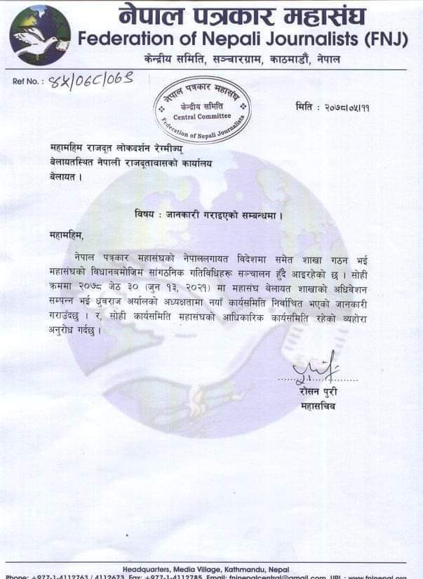 महासंघका महासचिव रोसन पुरीले बेलायतका लागि नेपाली राजदूत लोकदर्शन रेग्मीलाई पठाएको पत्रमा भनिएको छ – ‘नेपाल पत्रकार महासंघको नेपाल लगायत विदेशमा समेत शाखा गठन भई महासंघको विधानबमोजिम सांगठनिक गतिविधिहरु संचालन हुँदै आइरहेको छ । सोही क्रममा २०७८ जेठ ३० (जुन १३, २०२१) मा महासंघ बेलायत शाखाको अधिवेशन सम्पन्न भई ध्रुवराज अर्यालको अध्यक्षतामा नयाँ कार्यसमिति निर्वाचित भएको जानकारी गराउँदछु । र, सोही कार्यसमिति महासंघको आधिकारिक कार्यसमिति रहेको ब्यहोरा अनुरोध गर्दछु ।’