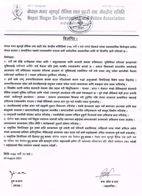 प्रेस बिज्ञप्ति: नेपाल मगर भुतपुर्वक सैनिक तथा प्रहरी संघ केन्द्रिय समिति