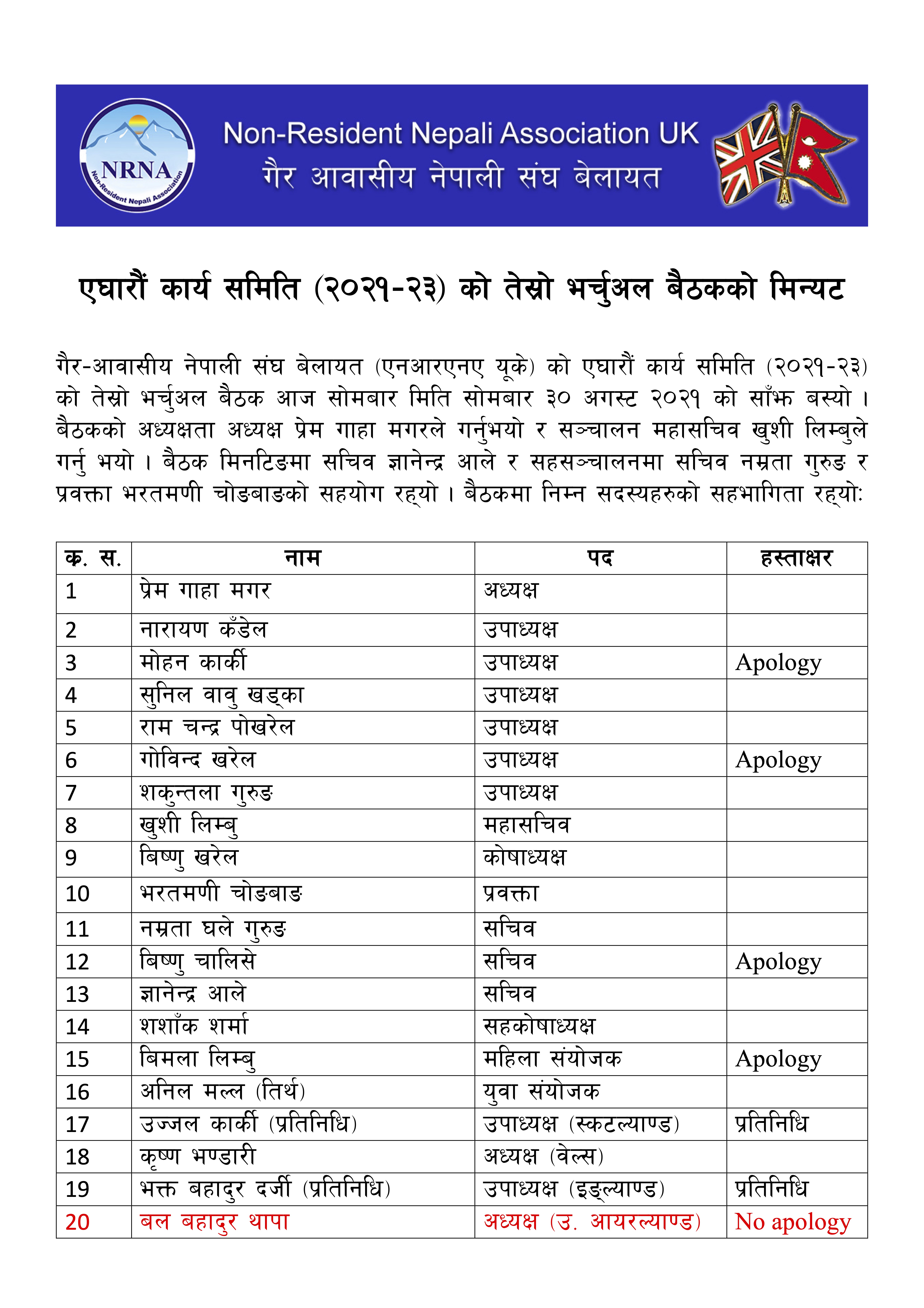 (११) अर्को बैठकः वर्तमानमा हरेक सोमबार साँझ ८ बजेबाट जूम बैठक बस्ने पूर्ववत निर्णयलाई बैठकले कायमै राख्दै कार्य समितिको अर्को प्रत्यक्ष बैठक अक्टोबर २ शनिबार अल्डरशटमा बस्ने निर्णय भयो ।
