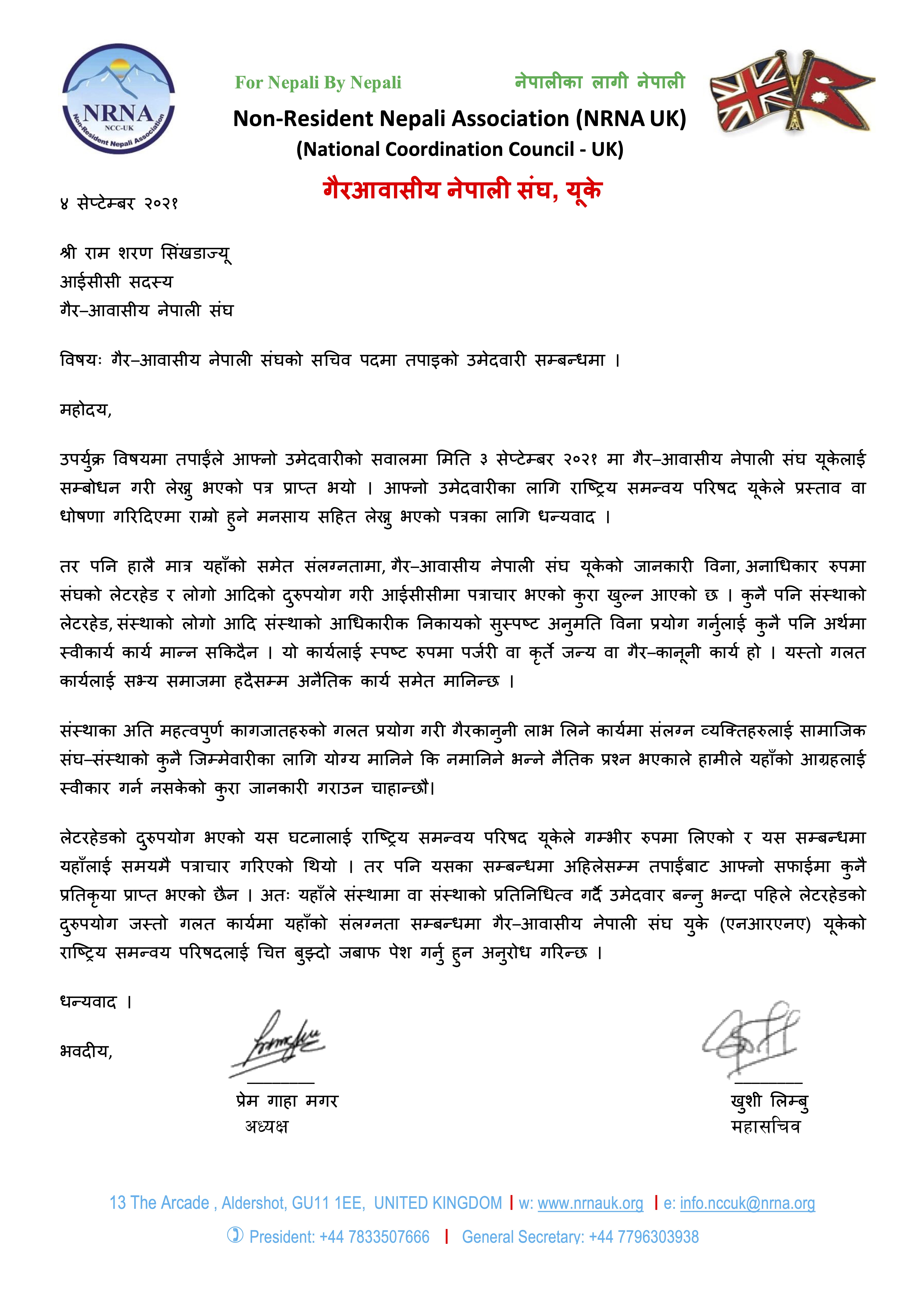 पत्रको जवाफ नदिइएको सम्बन्धमा उल्लेख गर्दै एनसीसी युकेले भनेको छ, “लेटरहेडको दुरुपयोग भएको यस घटनालाई राष्ट्रिय समन्वय परिषद युकेले गम्भीर रुपमा लिएको र यस सम्बन्धमा यहालाई समयमै पत्राचार गरिएको थियो । तर पनि यसका सम्बन्धमा अहिलेसम्म तपाईबाट आफ्नो सफाईमा कुनै प्रतिकृया प्राप्त भएको छैन । अतः यहांले संस्थामा वा संस्थाको प्रतिनिधित्व गर्दै उम्मेदवार बन्नु भन्दा पहिले लेटरहेडको दुरुपयोग जस्तो गलत कार्यमा यहांको संलग्नता सम्बन्धमा गैर आवासीय नेपाली संघ युकेको राष्ट्रिय समन्वय परिषदलाई चित्तबुझ्दो जवाफ पेश गर्नु हुन अनुरोध गरिन्छ । ”