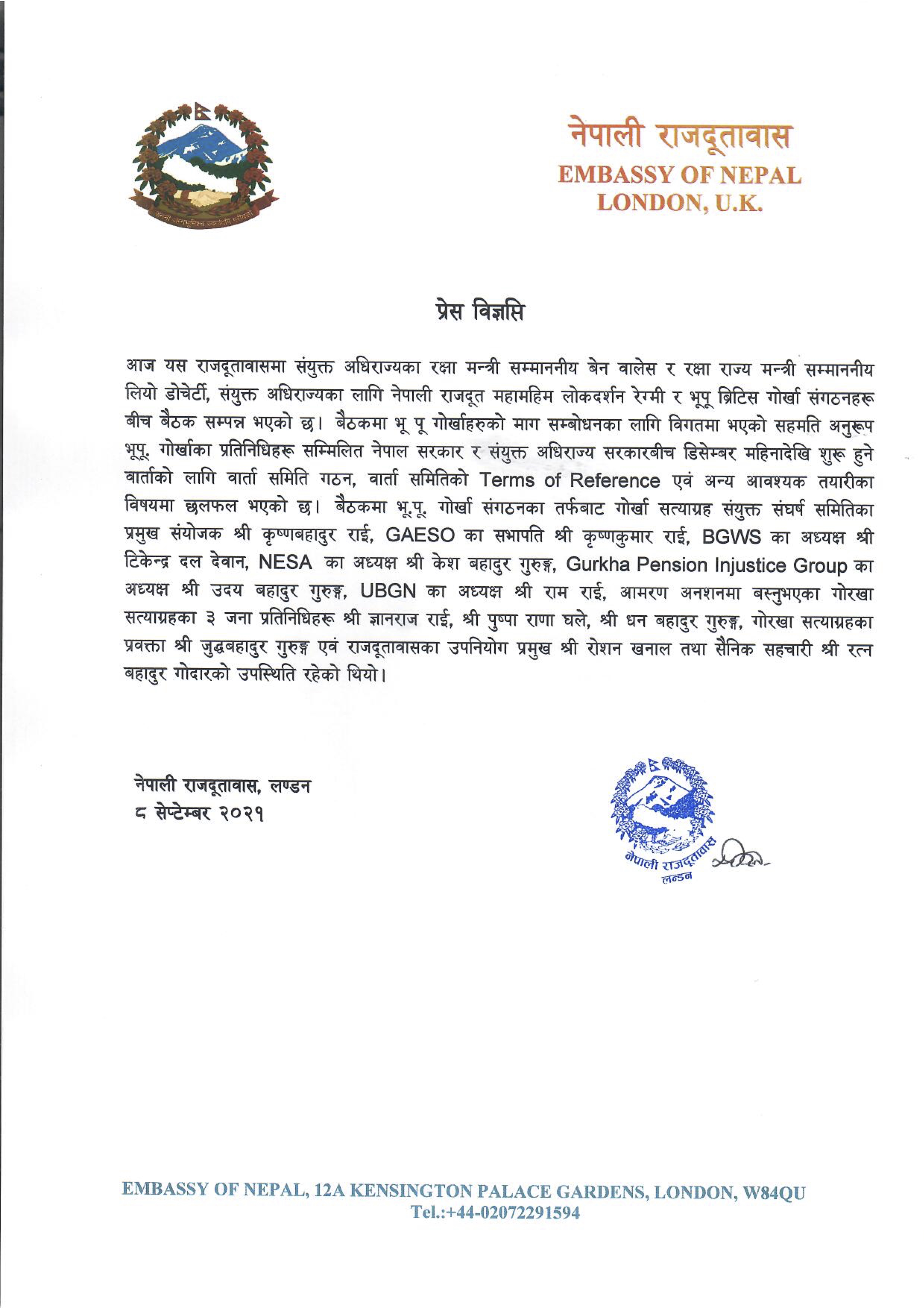 नेपाली दूतावास लन्डनमा सेप्टेम्बर ८ तारिखका दिन त्रिपक्षीय बैठक बसेको हो । बैठकमा भूतपूर्व गोर्खाहरुको माग सम्बोधनका लागि विगतमा भएको सहमतिअनुरूप भूपू गोर्खाका प्रतिनिधिहरू सम्मिलित नेपाल सरकार र संयुक्त अधिराज्य सरकारबीच डिसेम्बर महिनादेखि सुरू हुने वार्ताको लागि वार्ता समिति गठन, वार्ता समितिको कार्यविवरण एवं अन्य आवश्यक तयारीका विषयमा छलफल भएको दूतावासले विज्ञप्तिमार्फत जनाएको छ ।
