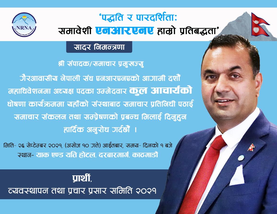 गैर आबशीय नेपाली संघ (एनआरएनए) को १० सौं महाधिशेनमा कुल आचार्यले केन्द्रिय अध्यक्ष पदमा घोषणा गर्दै।