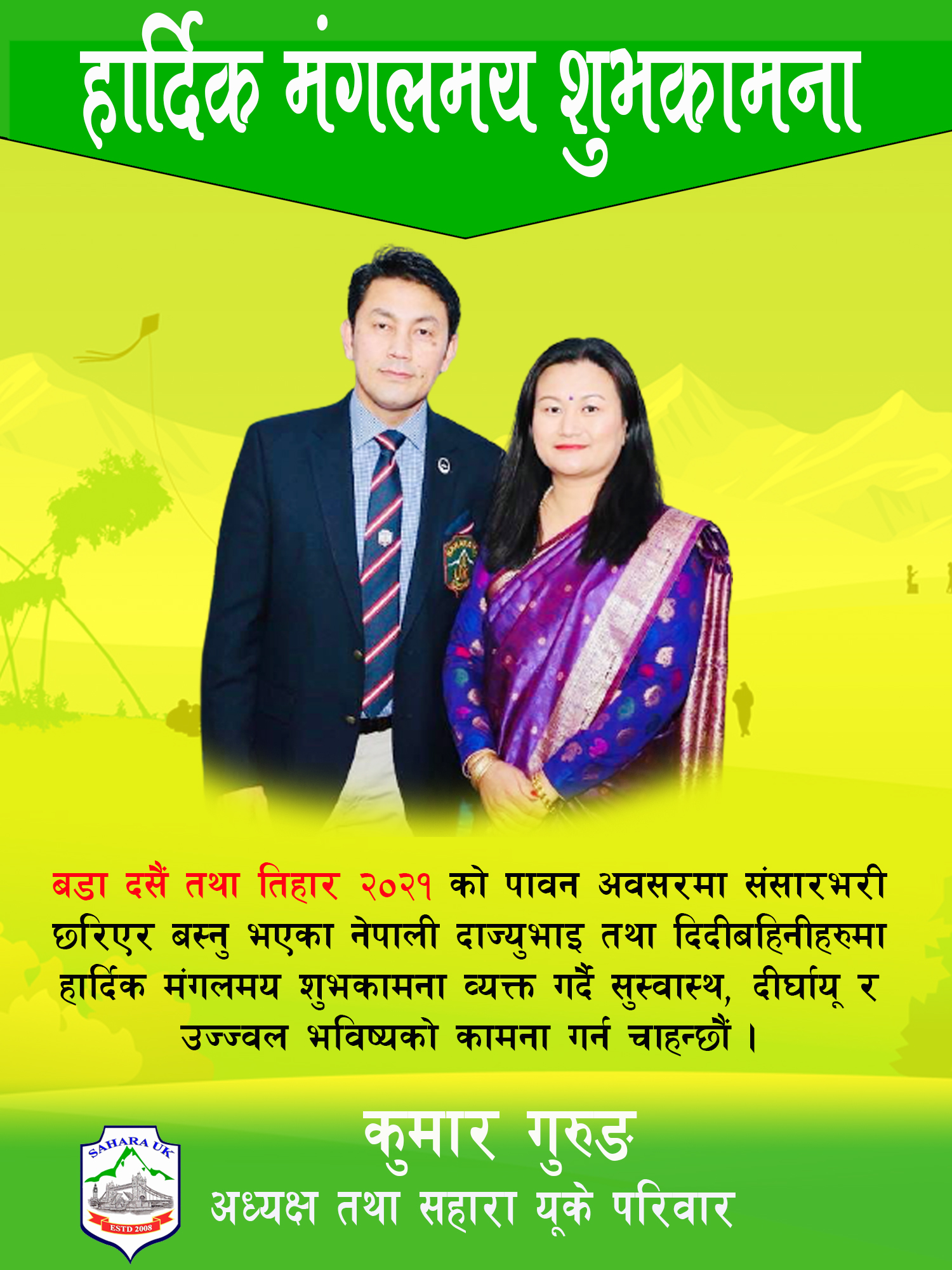 बडा दशैं तथा तिहार २०२१ को पावन अबसरमा संसारभरी छरिएर बस्नु भएको नेपाली दाज्युभाई तथा दिदीबहिनिहरुमा हार्दिक मंगलमय शुभकामना व्यक्त गर्दै उज्ज्वल भविष्य, सुस्वास्थ र दीर्घायूको कामना टक्र्याउन चाहन्छु ।