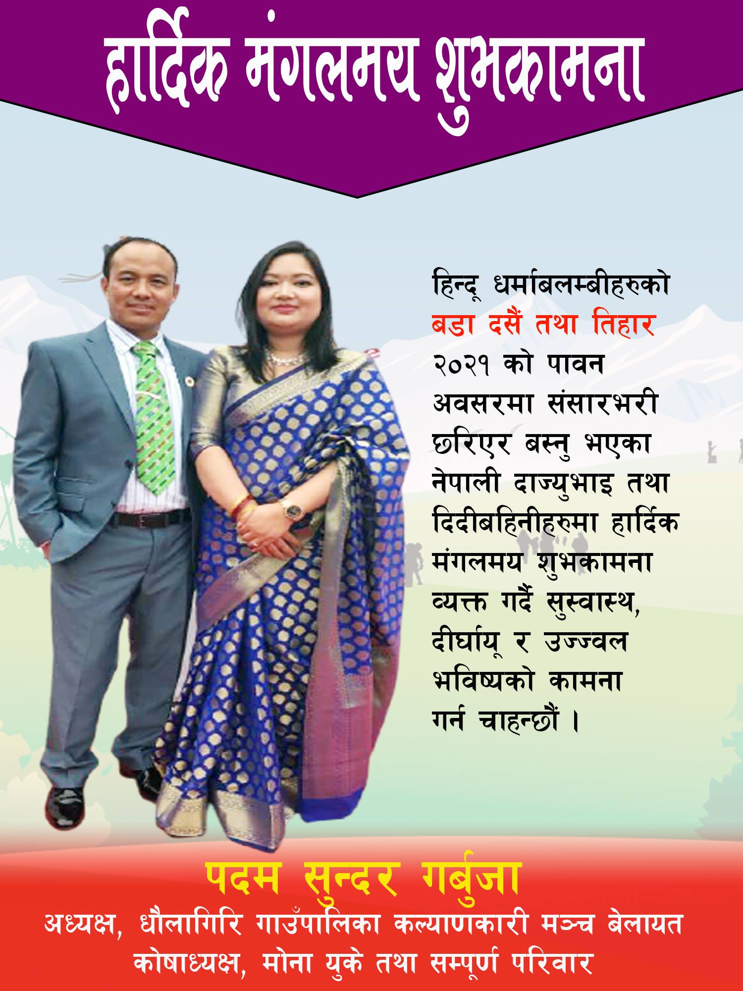 बडा दशैं तथा तिहार २०२१ को पावन अबसरमा संसारभरी छरिएर बस्नु भएको नेपाली दाज्युभाई तथा दिदीबहिनिहरुमा हार्दिक मंगलमय शुभकामना व्यक्त गर्दै उज्ज्वल भविष्य, सुस्वास्थ र दीर्घायूको कामना टक्र्याउन चाहन्छु ।
