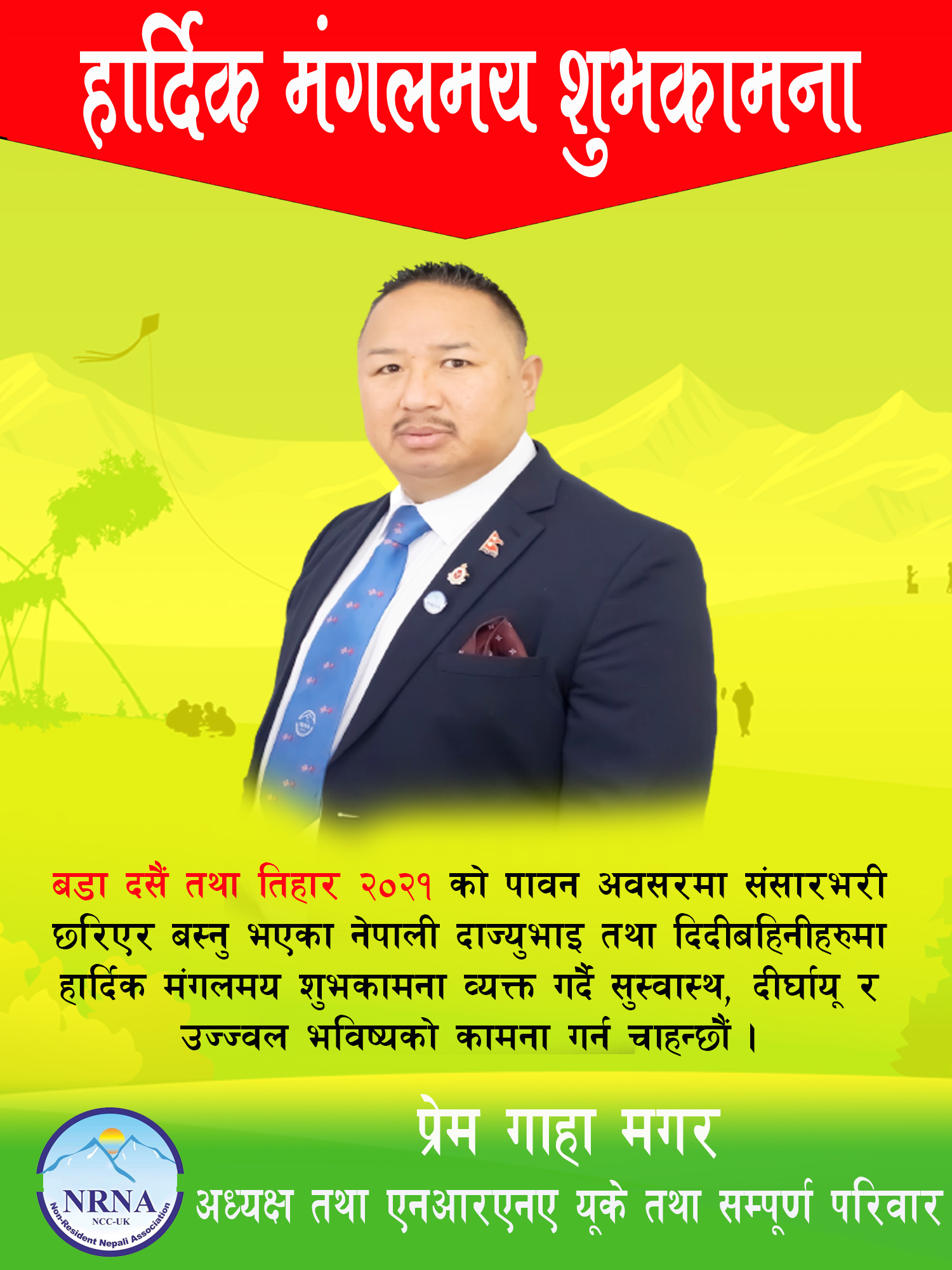 बडा दशैं तथा तिहार २०२१ को पावन अबसरमा संसारभरी छरिएर बस्नु भएको नेपाली दाज्युभाई तथा दिदीबहिनिहरुमा हार्दिक मंगलमय शुभकामना व्यक्त गर्दै उज्ज्वल भविष्य, सुस्वास्थ र दीर्घायूको कामना टक्र्याउन चाहन्छु ।