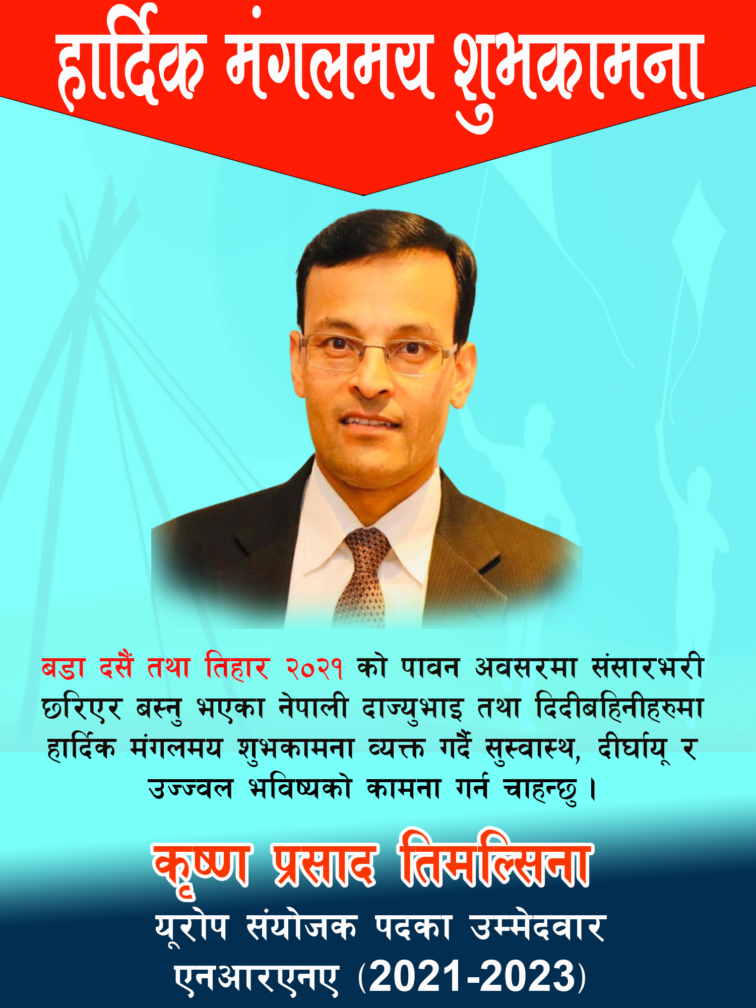 बडा दशैं तथा तिहार २०२१ को पावन अबसरमा संसारभरी छरिएर बस्नु भएको नेपाली दाज्युभाई तथा दिदीबहिनिहरुमा हार्दिक मंगलमय शुभकामना व्यक्त गर्दै उज्ज्वल भविष्य, सुस्वास्थ र दीर्घायूको कामना टक्र्याउन चाहन्छु ।