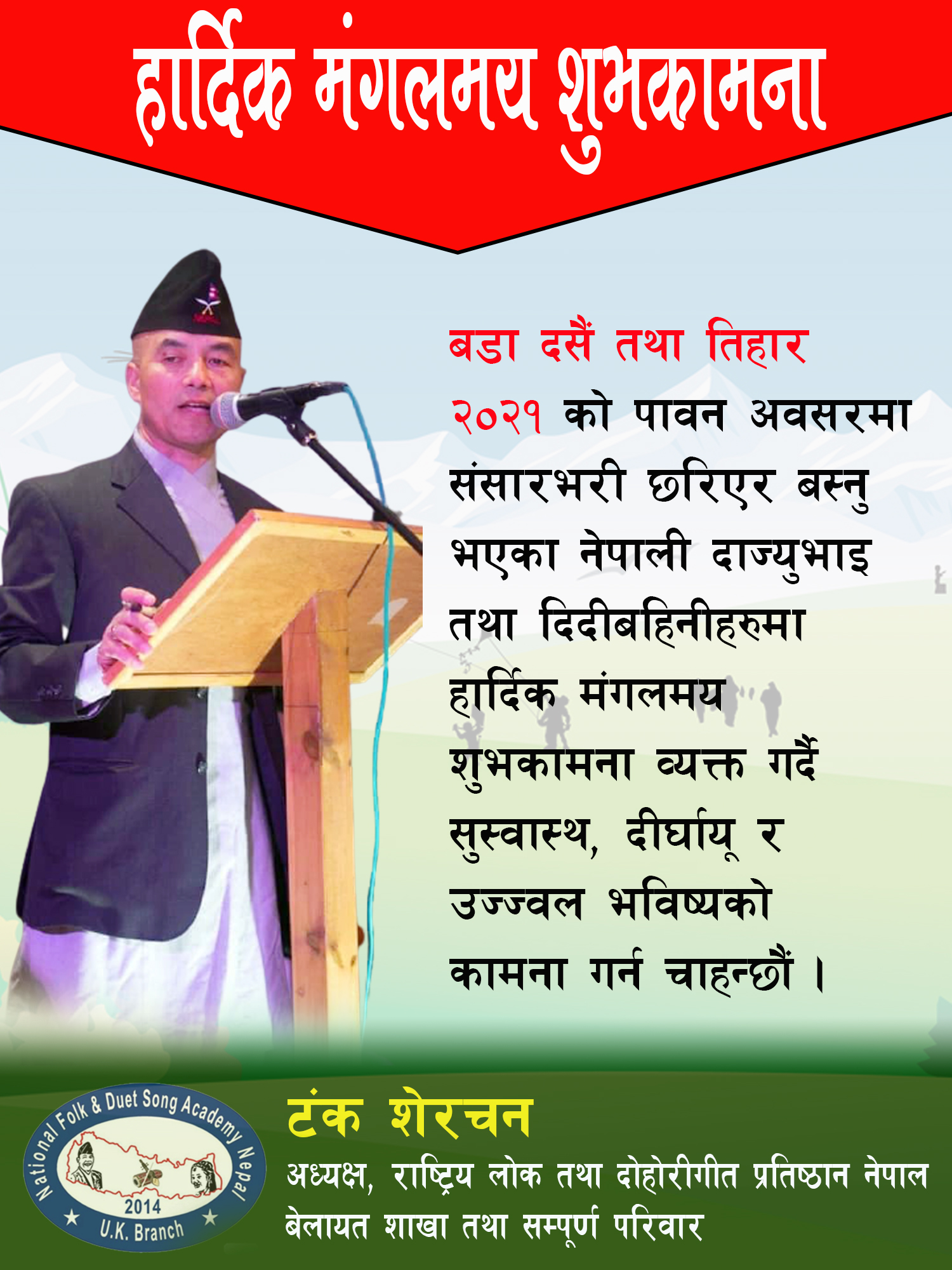 बडा दशैं तथा तिहार २०२१ को पावन अबसरमा संसारभरी छरिएर बस्नु भएको नेपाली दाज्युभाई तथा दिदीबहिनिहरुमा हार्दिक मंगलमय शुभकामना व्यक्त गर्दै उज्ज्वल भविष्य, सुस्वास्थ र दीर्घायूको कामना टक्र्याउन चाहन्छु ।
