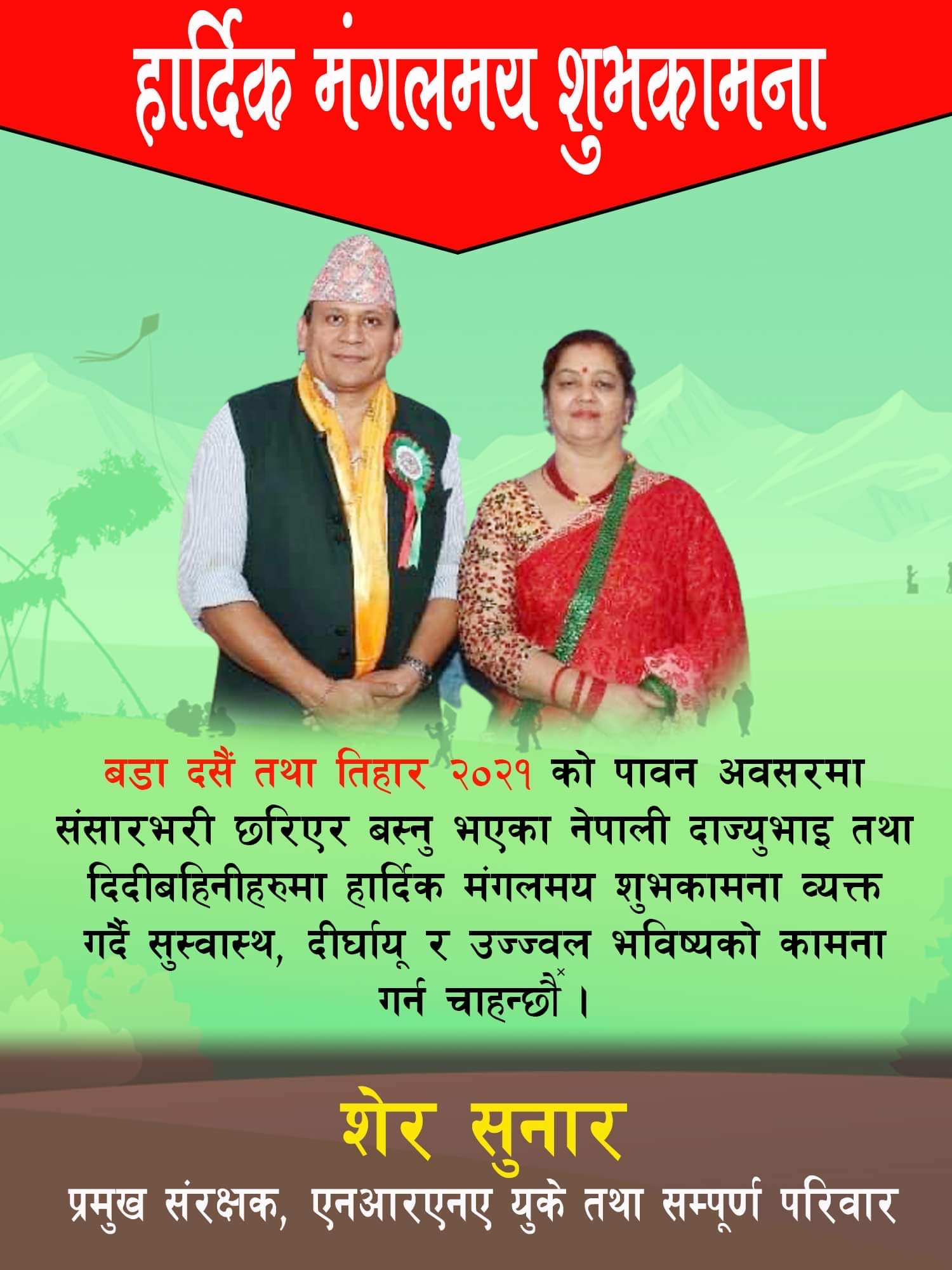 बडा दशैं तथा तिहार २०२१ को पावन अबसरमा संसारभरी छरिएर बस्नु भएको नेपाली दाज्युभाई तथा दिदीबहिनिहरुमा हार्दिक मंगलमय शुभकामना व्यक्त गर्दै उज्ज्वल भविष्य, सुस्वास्थ र दीर्घायूको कामना टक्र्याउन चाहन्छु ।