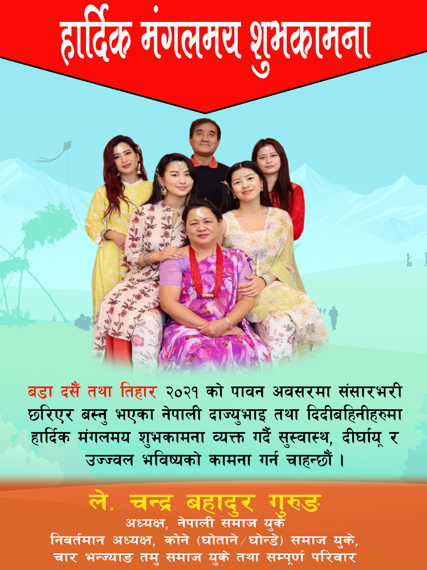 बडा दशैं तथा तिहार २०२१ को पावन अबसरमा बेलायतबासी संसारभरी छरिएर बस्नु भएको नेपाली दाज्युभाई तथा दिदीबहिनिहरुमा हार्दिक मंगलमय शुभकामना व्यक्त गर्दै उज्ज्वल भविष्य, सुस्वास्थ र दीर्घायूको कामना टक्र्याउन चाहन्छु ।