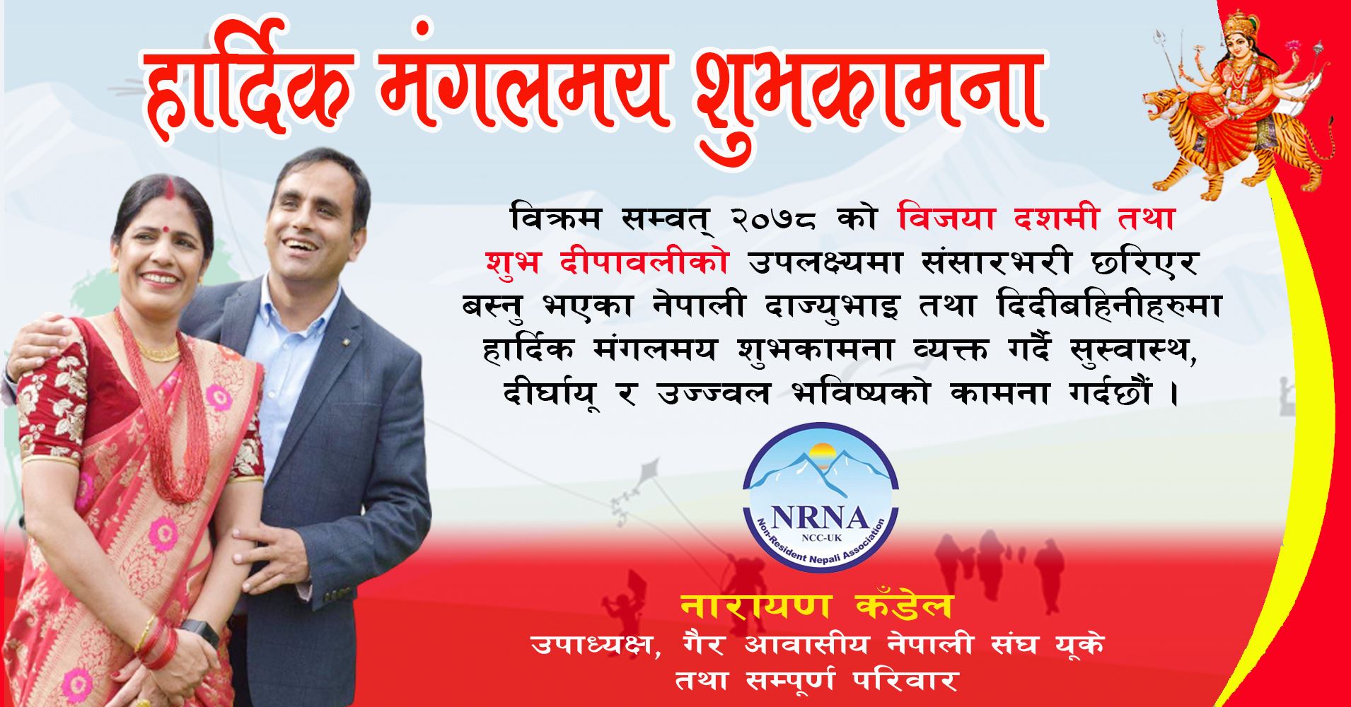 बिक्रम सम्बत २०७८ को विजय दशमी तथा शुभ दिपावलीको उपलक्षमा संसारभरी छरिएर बस्नु भएको नेपाली दाज्युभाई तथा दिदीबहिनिहरुमा हार्दिक मंगलमय शुभकामना व्यक्त गर्दै उज्ज्वल भविष्य, सुस्वास्थ र दीर्घायूको कामना टक्र्याउन चाहन्छु ।