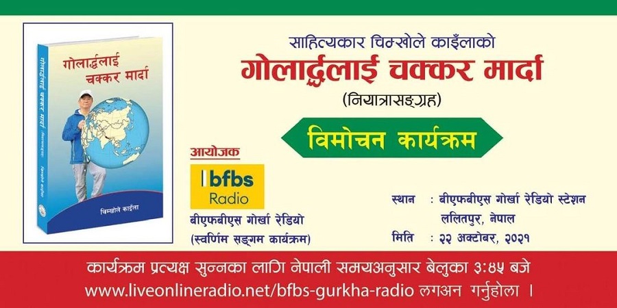चिम्खोले काइँलाद्वारा लिखित “गोलार्द्धलाई चक्कर मार्दा” भन्ने नियात्रासंग्रह बिएफबिएस गोर्खा रेडियोको लोकप्रिय कार्यक्रम स्वर्णिम संगमबाट आज बिमोचन हुने भएको छ।