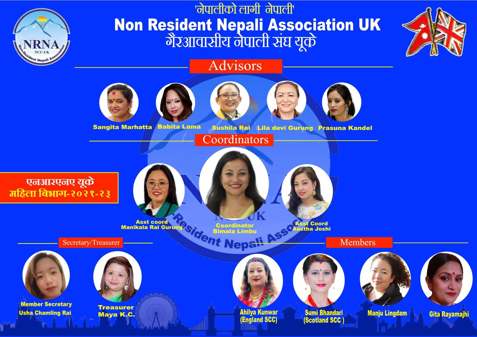 एनआरएनए यूकेको महिला बिभागका संस्थापक संयोजक संगीता मरहट्ठा (२०११–१३), पूर्व संयोजकहरु बबी लामा (२०१३–१५), सुशीला राई (२०१५–१७), लिलादेवी गुरुङ (२०१७–१९) र प्रसुना कँडेल (२०१९–२१) पाँचै जनालाई सल्लाहकार राखिएको छ । एनआरएनए यूकेको महिला बिभागमा नर्दर्न आयरल्याण्ड, वेल्स र मिडल्याण्डबाट कम्तिमा एक एक जना प्रतिनिहिरु आएपछि समितिले पूर्णता पाउने संयोजक बिमला लिम्बूले बताइन् ।