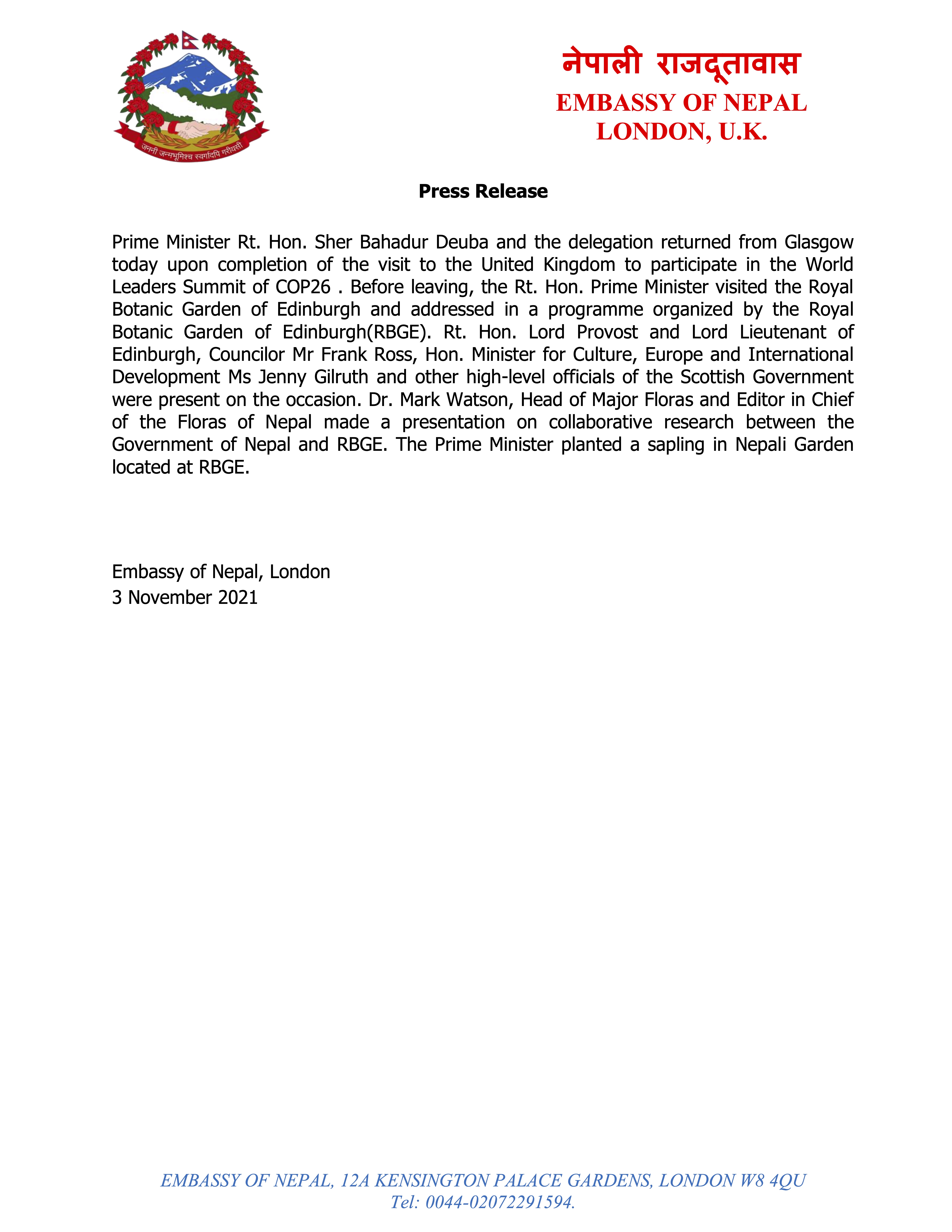 Please find the original Press Release by the Embassy of Nepal, London regarding Prime Minister Rt. Hon. Sher Bahadur Deuba and the delegation returned from Glasgow.