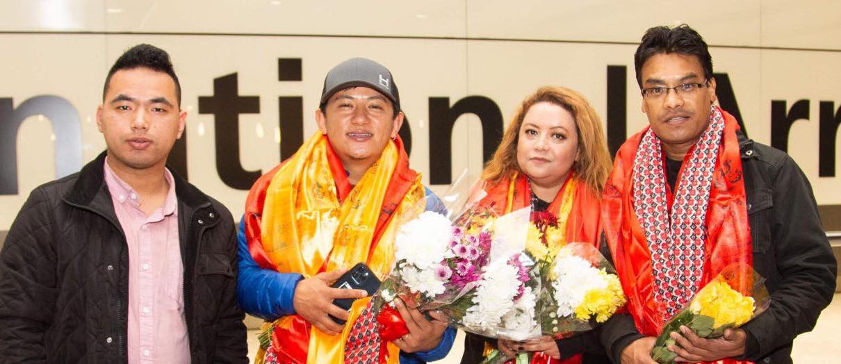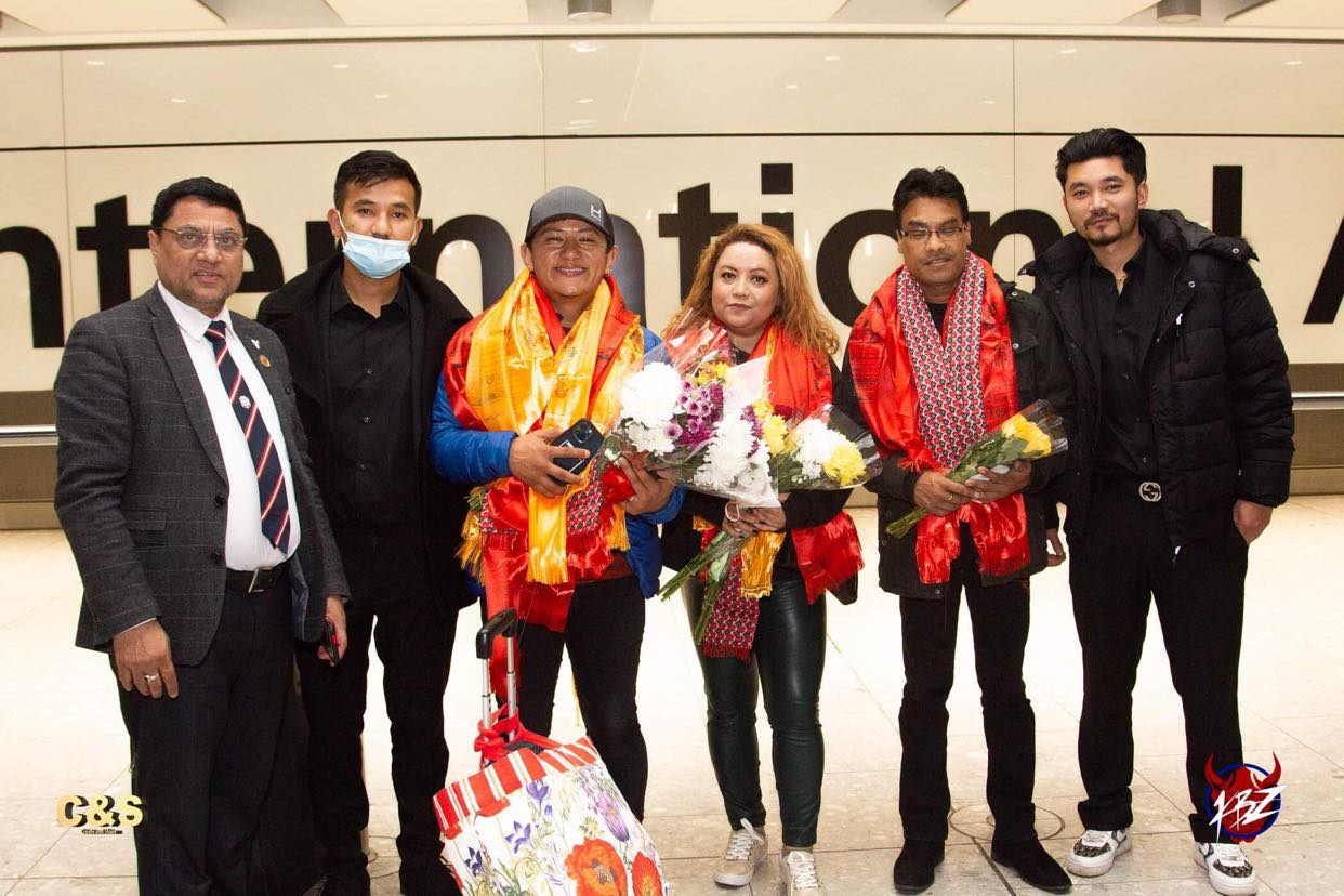 तस्विर सौजन्य: क्रिएट एन्ड शेयर लन्डन । बेलायतमा आयोजना हुने एक सांगीतिक कार्यक्रममा प्रस्तुति गर्न गायकद्धय राजु लामा र सञ्जिप प्रधान लन्डन आइपुगेका छन् । आगामी शुक्रबार साँझ अल्डरसटको एम्पायर हलमा हुने एचके नाइट २०२१ का लागि गायकद्धय बेलायत आएका हुन् । सोमबार साँझ लन्डन हिथ्रो विमानस्थलको टर्मिनल ५ मा उत्रिएका गायकद्वय लामा र प्रधानको साथमा गायिका सरिष्मा अमात्य समेतलाई एचे नाइटका आयोजकहरुले स्वागत गरेका थिए । आयोजक हंककंग युथ नेप्लिज एशोसिएसन यूकेका अध्यक्ष सुवास घोतानेका साथमा राजन गुरुङ, हेम गुरुङ, अजय श्रेष्ठ, मिका , पप्पु, आशिष, सुदिप, सुबाससहित सो समूहका दुई दर्जन सदस्य गायकहरुको स्वागतका लागि विमानस्थल पुगेका थिए । कार्यक्रमको प्रमुख प्रायोजक वाटरमेलन मोर्गेजेजका निर्देशक किरण गुरुङ पनि कलाकार स्वागतका लागि हिथ्रो गएका थिए ।