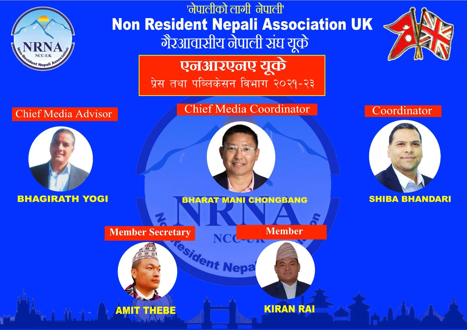 लण्डन । गैर-आवासीय नेपाली संघ (एनआरएनए) यूकेको चालु कार्यकाल २०२१–२३ का लागि प्रेस तथा पब्लिकेशन विभाग (मिडिया समिति) बनेको छ । विधानतः संघका प्रवक्ता भरतमणी चोङबाङ प्रमुख संयोजक रहेको नयाँ समितिको प्रमुख सल्लाहकारमा बरिष्ठ पत्रकार भगीरथ योगीलाई चयन गरिएको छ । समितिमा प्रवक्ता चोङबाङ लगायत अन्य तीन जना सदस्यहरु चयन गरिएको छ । जसमा लण्डन नेपाल न्युज डट कमका सम्पादक शिव भण्डारी संयोजक, सिलौटी टाइम्स डट कमका सम्पादक अमित थेबे सदस्य सचिव र सिलिचुङ डट कमका सम्पादक किरण राई सदस्य रहेका छन् । यसैवीच, एनआरएनए यूके हाल आफ्नो नियमित मुखपत्र ‘एनआरएन भ्वाइस’ को नयाँ अंक प्रकाशन गर्ने अन्तिम तयारीमा जुटेको छ । नयाँ अंकको संयोजन प्रवक्ता भरतमणी चोङबाङ आफैंले र सम्पादन खुशी लिम्बुले गरिरहेका छन् ।
